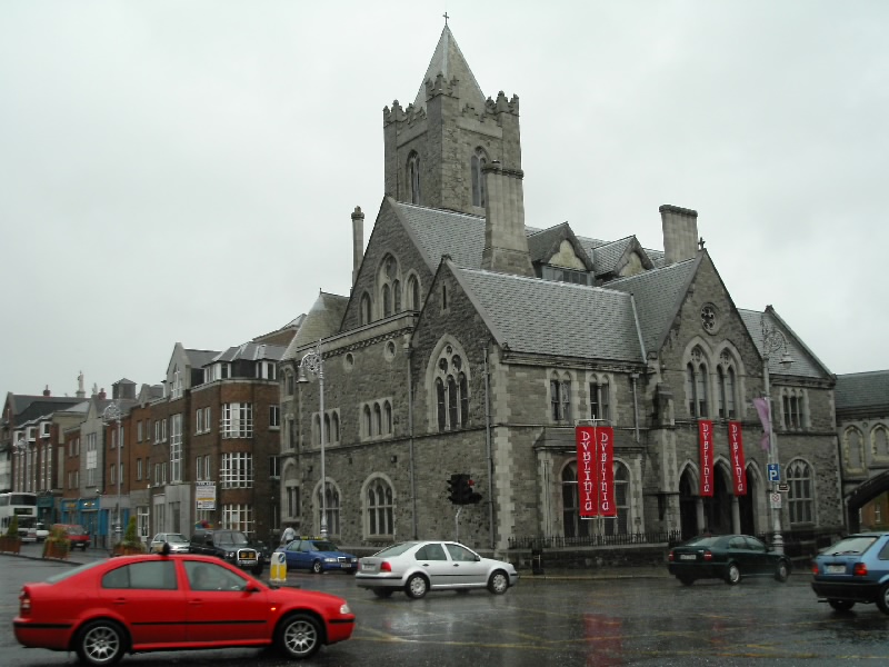 お店をでると、雨はほぼ上がった感じ。今日はギネスストアに行きたいのだが、歩くと20分程だろうか、ちょっと離れたところにあるので今のうちに行きましょうか。歩き始めてしばらくすると、またぽつぽつと雨が降ってきた。仕方がないなあ。このあたりはテンプルバーと呼ばれるエリアで、たくさんのパブやレストランが並んでいる。今日の晩ごはんはこのあたりにしましょう。テンプルバーのエリアを抜けると、雨がだんだん強くなってきた。いい感じの建物がたくさんあるので写真を撮りたいのだが、風も強いのでカメラを濡らさないようにしながらなんとか写真をとる。さらに進む。いつのまにやら、大雨ではないか。靴もジーパンもぬれてきたぞ。でもここまできたら行くしかないので、ひたすら進む。
