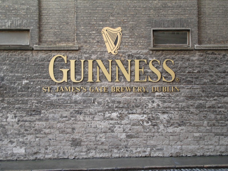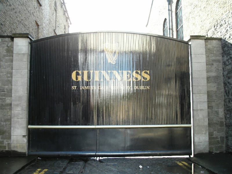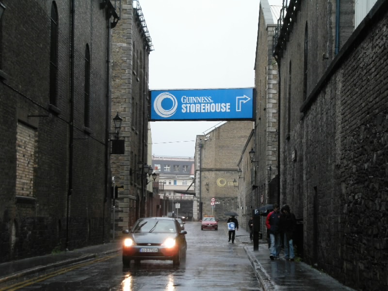 それにしても、すれ違う人の半分は傘をさしていない。イギリス人は少々の雨では傘をささないというが、アイルランドもそうなのだ。ていうか、これは少々の雨か?どうみても大雨なのだが・・・もう少しで到着だ。ふと気づくと、どこからか香ばしい香りがする。パンを焼くような、芋を焼くような、そんな香りだ。どうやらこれはギネスビール工場からのようだ。その香りに引き寄せられるように進んでいくと、ようやくギネスストアの案内板が。工場の建物の間を抜けると、そこには入口が。やっと到着だ。ずいぶんと濡れてしまったが、中は暖かいのですぐに乾くだろう。