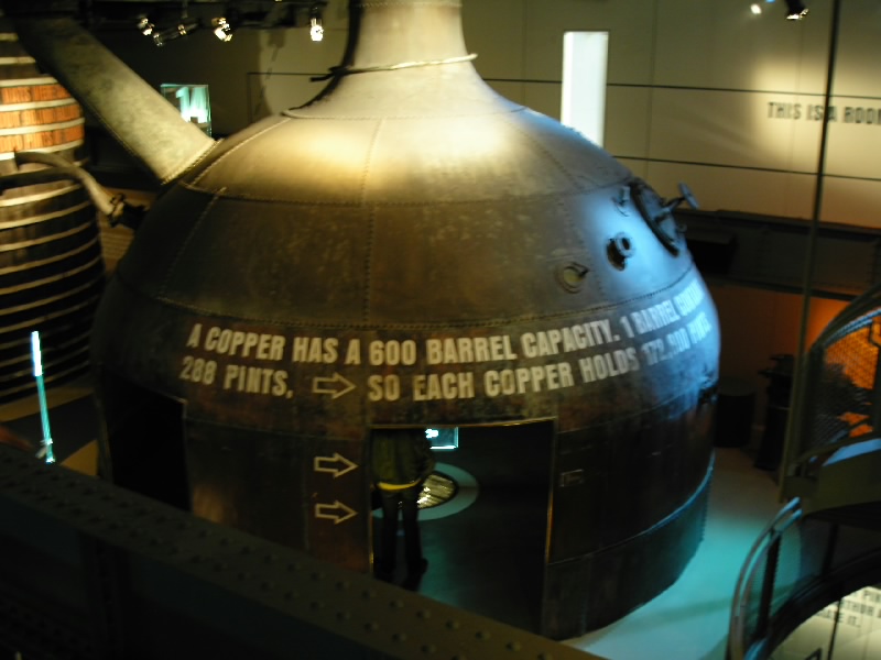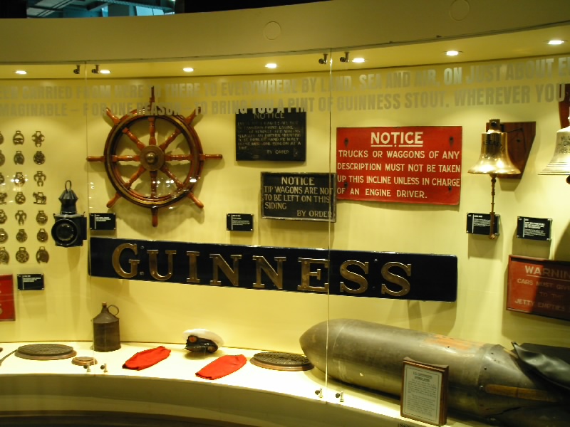 エスカレータを上がるとそこは広いホールのようになっており、おねえさんがチケットカウンターへと案内してくれた。ここでチケットを買うのであるが、このチケットでギネスに関するいろいろな展示のみならず、最上階の展望台でギネスビールを一杯飲むことができ、さらに中にギネスの原液が入っているので記念品にもなるのだ(@13.5E)。では順番に見ていきますか。2階に上がると樽がつまれた部屋があった。中にはいると一人の職人が樽を作っている古い映像が流れていた。まさに職人技だ。道具は専用のものではあるが、あとは職人の勘で木が削られ、樽ができあがっていく。すごいね。ほかの部屋ではギネスが世界中に輸出されていることとか、現在の製造工程とか、興味深い内容の展示がされていた。