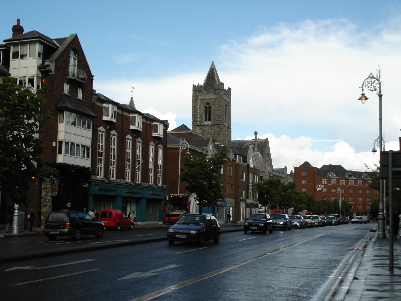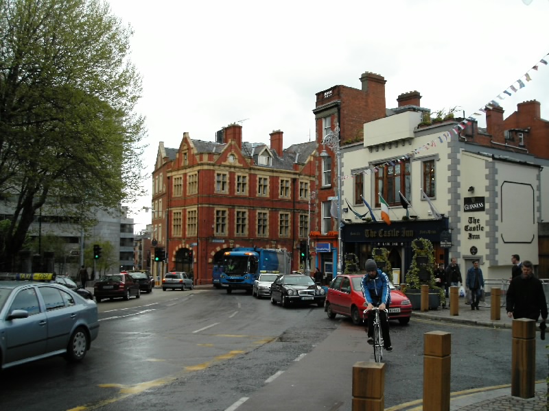 外にでると、太陽がとてもまぶしい。今のうちに帰りましょう。来た道を戻るのであるが、さっきは雨の中でろくに写真がとれなかったので、たくさん撮ろう。それにしても、パブがそこらじゅうにあるね。まさにアイルランドの人たちとパブは切り離せない関係なんだな。そしてそこで飲まれるギネス、これは大発明かもしれないな。テンプルバーを過ぎるころ、少し雨が降ってきたようだ。でもここまでくればホテルは近い。トリニティカレッジ近くのバス停は、ちょうど帰途につく学生たちでいっぱいだ。その中を抜け、無事にホテル到着。昨日は遅くて閉まっていた地階のパブも、今日はやっているようだ。部屋に入って荷物を置き、しばし休憩。今日はよく歩きました。
