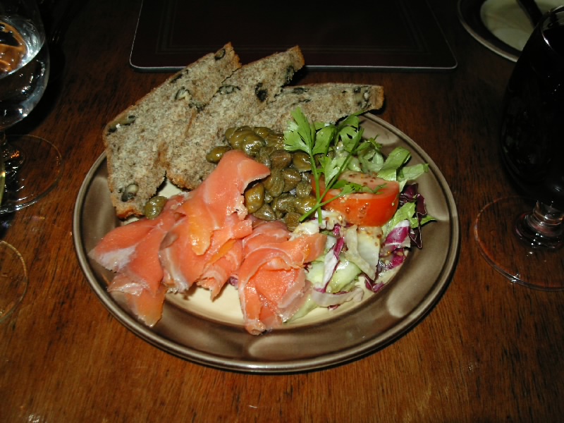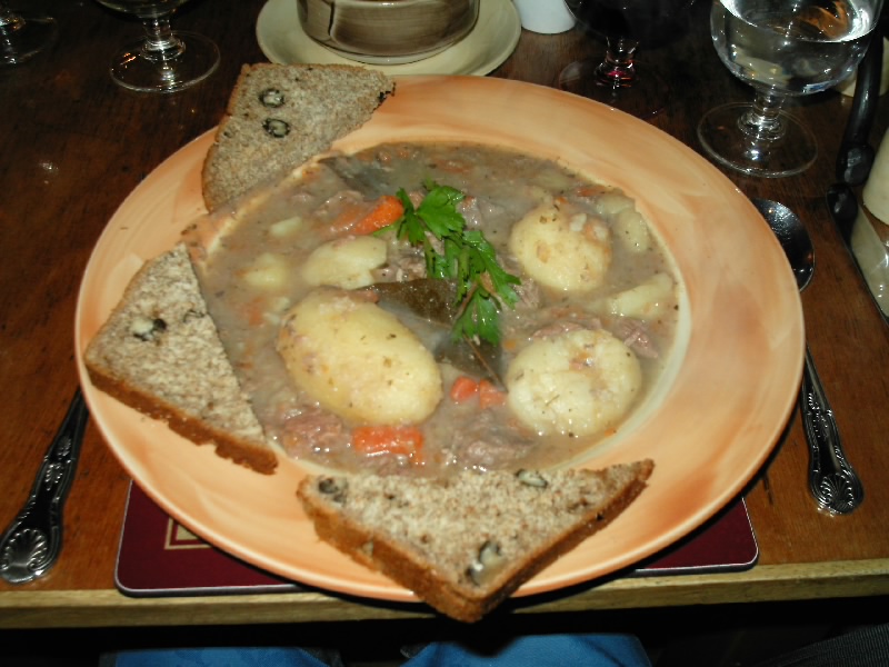 そろそろ7時。晩ごはんに行きましょうか。イタリアだとまだまだ晩ごはんには早いが、ここアイルランドでは9時ごろまでに食べないと、食べ損ねることもあるらしい。お国柄だね。目的地はテンプルバーだ。すでにたくさんの店に明かりがともり、人も増えつつあるようだ。いくつかお店を見て回り、Shackという店に入ることに。中に入ると、もうすでに何組か食事中のテーブルがあった。席に案内され、さて何にしましょうか。前菜にスモークサーモン、メインにラムシチューとベーコン&キャベッジをオーダー。さっきギネスを飲んだので、お酒はワインにしましょう。グラスワインのラージサイズをオーダーしたら、普通のグラスになみなみ入ったワインが出てきた。しばらくして、スモークサーモン登場。さっそく食べてみよう・・・これはうまいぞ。しっかりとしたオークの香りがあり、とろけるような舌触りだ。白ワインとよくあうね。それと付け合わせのパン、ちょっと量が多いと思ったが、ソーダブレッドというアイルランドのパンで意外に軽く、味もよく、結局全部食べてしまった。そしてメイン登場。ラムシチューはじゃがいもがごろごろと入っているぞ。羊の肉もたくさん入っているが、思ったほどの羊臭さもなく、あっさりとした味付けでどんどんと食べられる。さすがにこの付け合わせのパンまでは食べ切れなかったけどね。もう一つはベーコン&キャベッジ。すごい量のベーコンだが、日本で想像するようなベーコンとは異なり、豚肉を少しスモークしたような感じの肉。これも見た目よりもずっと軽く、するすると食べられる。キャベツもうまいのだが、それよりも付け合わせの温野菜。ここのじゃがいもが実にうまいのだ。さらにこれほど温野菜がつくとは思わなかったのでポテト&チーズをオーダーしていたのだが、これがまたすごい量で実にうまい。やはりアイルランドはじゃがいもの国なのかな。でも芋がこれほど多いと、おなかはいっぱいだ。隣の客は巨大なバナナのデザートまで平らげていたが・・・ごちそうさまでした(65E)。