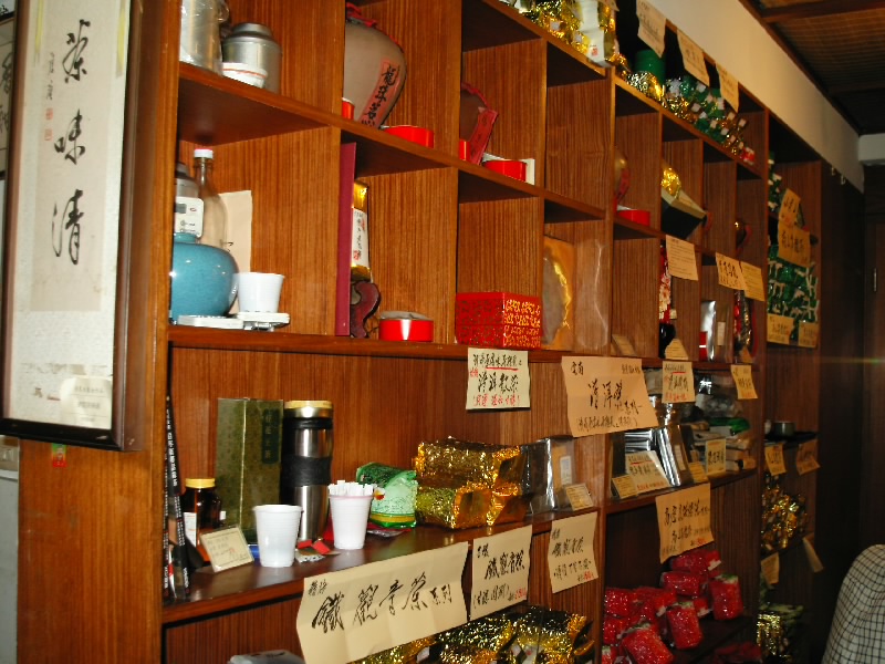 暫くのんびりとお茶を楽しんでいると、別の男性が話しかけてきた。とっても流暢に日本語を話す。ホントに日本人みたいね。ここのお茶の説明をしてくれる。自家焙煎の高山烏龍茶とプーアール茶がお勧め。独自の自家焙煎法により渋みのない上品なお茶が頂けるとのこと。私の目の前の大きな3台の機械は焙煎機なんだって。私の飲んでいる「奶香熱潽洱」というプーアール茶もお勧めの一品だそう。でも値段を聞いてビックリ!店内では120元と手軽に頂くことができる料金だけど、販売用の茶葉は600gで6400元。たっ高過ぎる。それ程の価値があることは沢山の話を聞いてよく分かったけど、私には高価な代物でした。