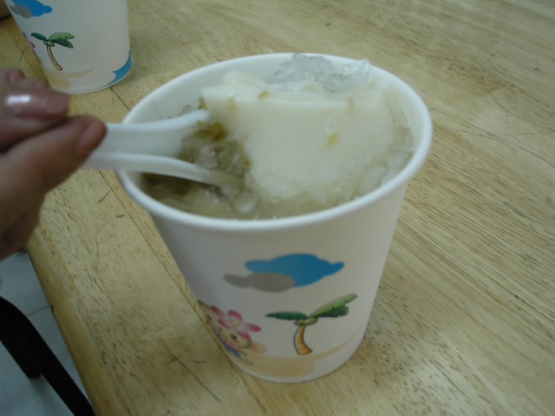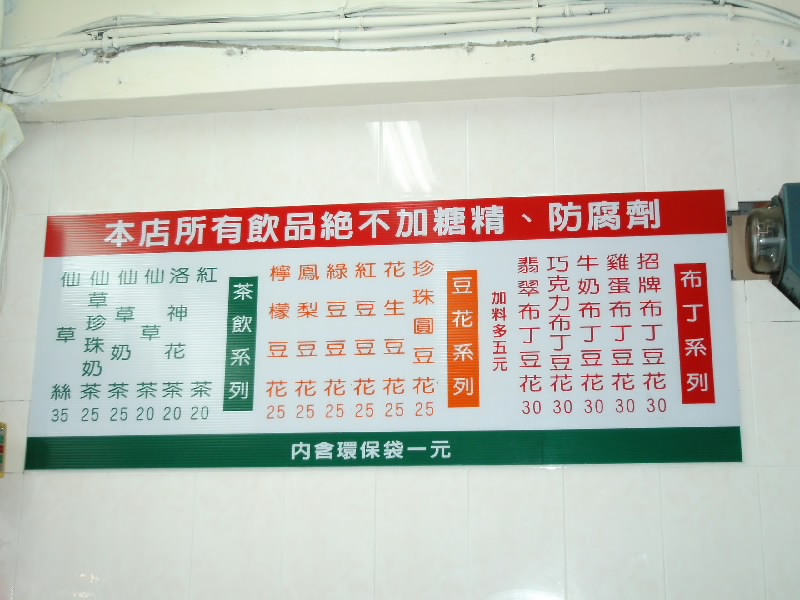 ナンシーさんがお勧めの豆花屋があると言うので食べることにした。「豆花」とはお豆腐のデザート。台湾や香港、多分中国でもポピュラーなデザートで、最近日本でも流行ってるよね。ナンシーさんお勧めのお店は、以前日本の雑誌でも紹介したんだって。豆花+トッピングが選べる。ナンシーさんはピーナッツが好きと選び、私は緑豆を選んだ。その上にさっぱりしたシロップをかけて、それだけのシンプルなデザート。またご馳走になっちゃった。この豆花も台湾に来る楽しみのひとつなのよね。さて、お勧めのお味は・・・・。何となく普段食べているモノより味が濃い気がする。とっても美味しいと私が言うと、ナンシーさんは壁に張ってあるメニューを指差した。「絶不加糖精・防腐剤」とある。読めないけど漢字だから意味は伝わる。そうか、無添加なんだ。同じようにみえる屋台の食べ物でも結構差があるんだって。