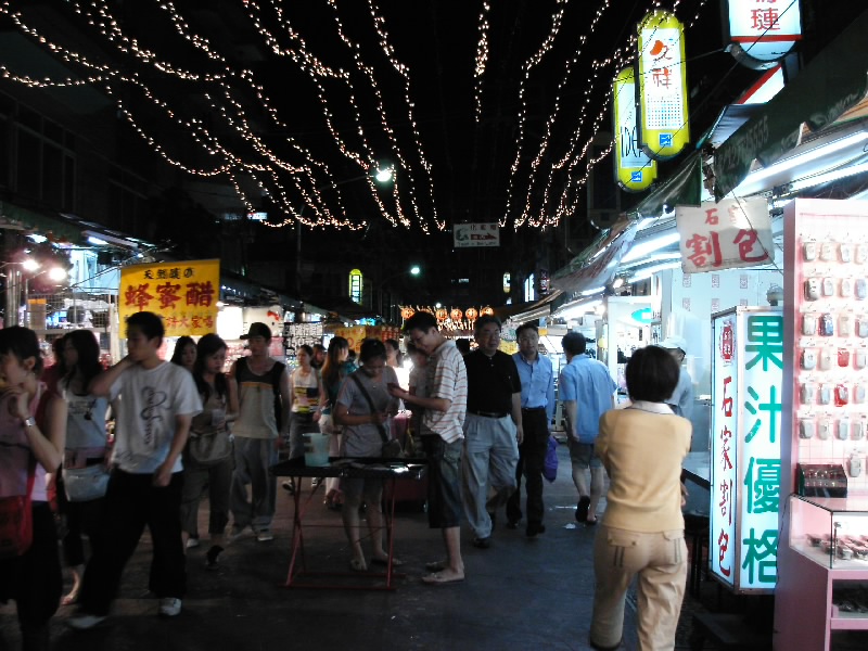 「臨光街観光夜市」。でもナンシーさん曰く、今は「通化観光夜市」っていうそう。士林夜市よりもずっと小さい夜市だけど料理屋台が充実しているとガイドブックに書いてあった。だから来てみたかったんだぁ。確かに美味しそうなものがあちらこちらに売っている。でもファッション系なども思ったより充実してる。何よりも人出が程々で丁度いい。士林では満員電車のように混んでるもんね。この位なら風も通るし暑いなりに涼しさも感じられる。Tシャツやサンダル、アクセサリーも凄く安い価格で売っている。勿論それなりの品物という感じだけど、使い捨て気分で割り切れば、変わったデザインのモノが多いし楽しいかも。掘り出しものもあるかもしれないね。「好きなお店に入って好きなだけ見てね」とナンシーさんは言ってくれるけど、特に欲しいものがあるワケではないのよ。そぞろ歩いて雰囲気を楽しむのが好きなの。