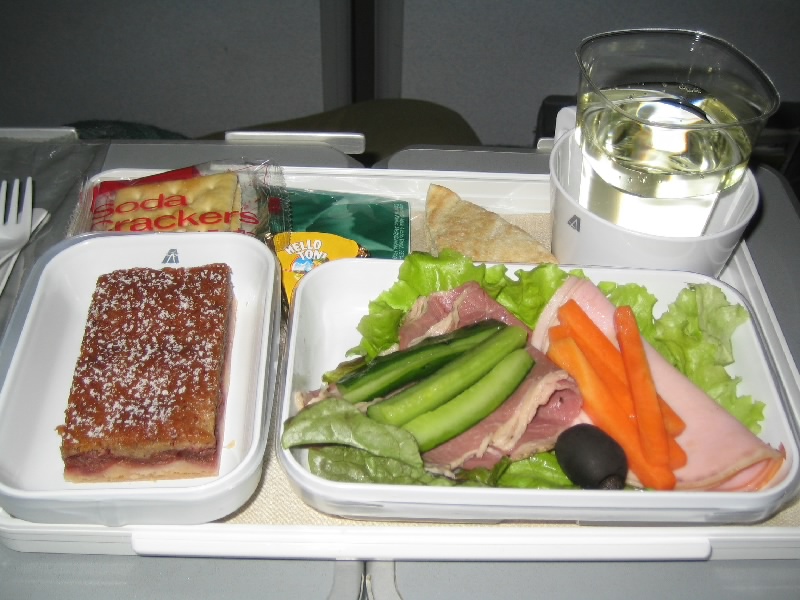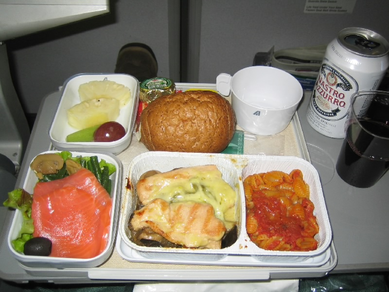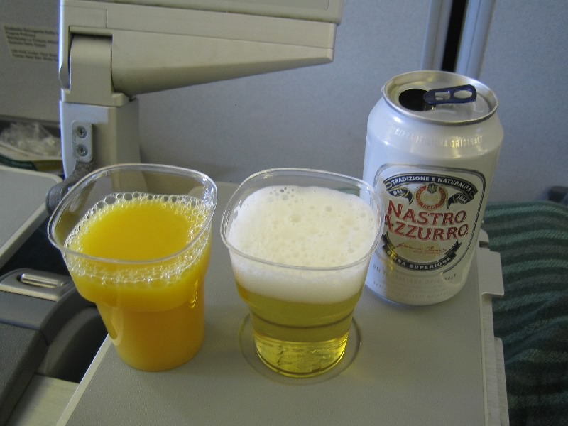 出発ゲートまで待っていると、思ったよりも早く搭乗開始となった。われわれは32のDE、ラオターずは42のDE。10番離れるとほとんど見えないな。でも飛行機は満席でもなく、ぱらぱらと空きがある。それならばもう少し席が近くなるように考えられると思うのだが・・・いかんいかん、それをアリタリアに求めてはいかん。乗せていただけるだけでありがたいと思わねば。回りはツアー客らしく添乗員らしき人が数を確認していた。飛行機は定刻を少し遅れ、ミラノに向けて出発だ。12時間の長い空の旅が始まった。いつも通り、ビールとオレンジジュースで乾杯だ。後ろのラオターずは何を頼んでいるのだろうか。前回の珍道中ではアルコールが頼めることも知らなかったが、もう旅なれたもんだよね。ほどなく機内食がスタートだ。アリタリアなので、当然イタリアンを頼む。前菜のサーモン、トマトのパスタ、メインもサーモン?。かぶっているが、なかなかうまいぞ。飲み物にはワインとスプマンテをもらおうとしたが、何とスプマンテのサービスはなくなっていた。5月はちゃんとミニボトルのスプマンテがあったのに・・・しかもワインがミニボトルから、グラスに注ぐサービスに変わっていた。ミニボトルのほうが手軽でいいのだが、とうとうアリタリアにも経費削減の波が押し寄せてきたのか。まあそれでもJAL機内食よりずっといいな。チーズとクラッカーもついているし、パンもうまいし。長いフライト、ゆったりと頂きましょうよ。で、残念ながらラオターずは、目の前でイタリアンがなくなり和食となったらしい。アリタリアの和食ってまだ食べたことないのよね・・・