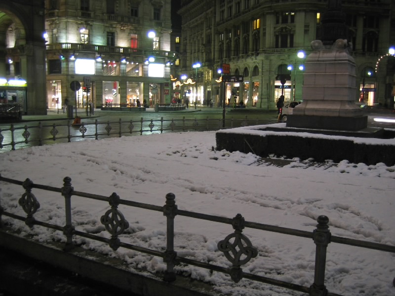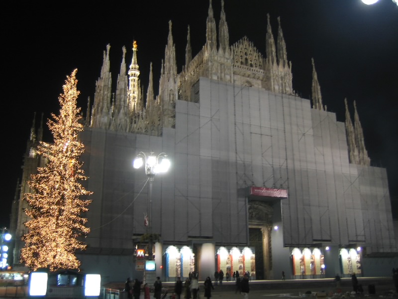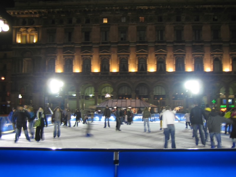 というわけで久しぶりのドゥオモと対面だが、やっぱり工事中だよ。この前見たのは2002年、いつまでやってんだよ〜。ドゥオモ広場には仮設のスケートリンクがあり、たくさんのミラノっ子たちがスケートを楽しんでいる。まわりには雪が積もっているぐらいだし、この寒さならば氷もいい状態なのだろう。寒いのだが、広場にはけっこう人がいるぞ。観光客が多いのかな。せっかくなのでたくさん写真を撮りましょう。ドゥオモの横や後ろは工事中ではないので、荘厳な石造りがよくわかる。凛とした空気の中、歴史の迫力を感じる。