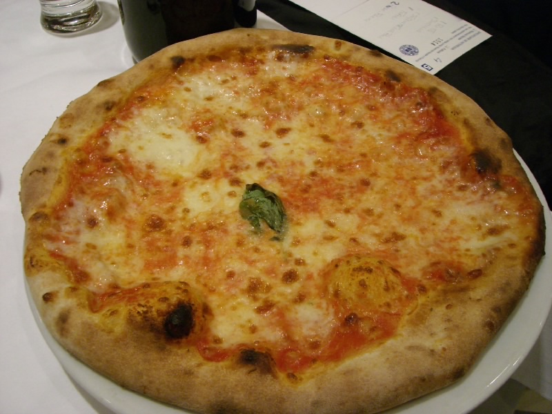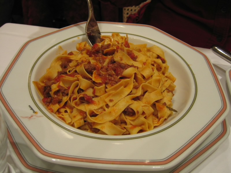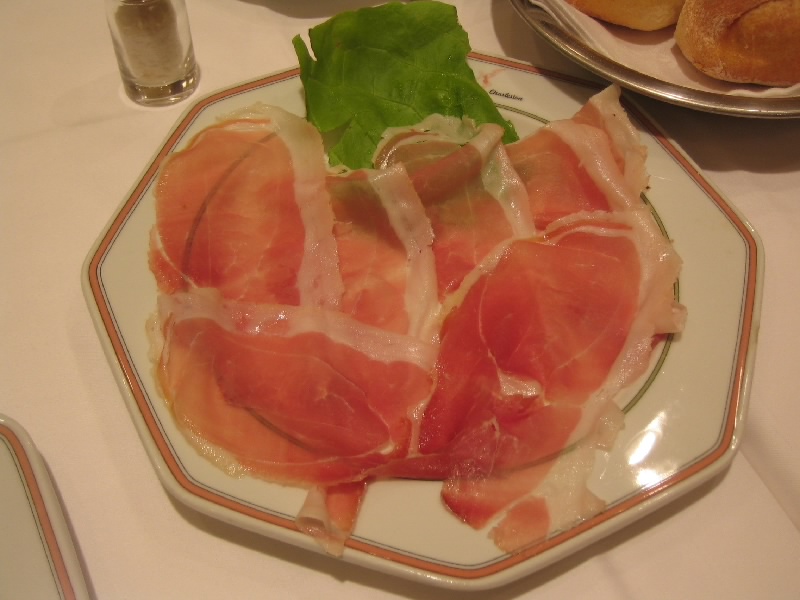 さて、ごはんへと行こう。今日は時間も遅いし、疲れているしなのでドゥオモ広場から少し歩いたところにあるレストラン、Charlstonへと行きましょう。お店は明るく、結構賑わっている。4人テーブルを用意してもらい、さあて何にしましょうか。今日は軽めでいいので、生ハムとパスタ、ピザなどをざっと頼む。あとはハウスワインの赤を1リットル。ぐっすり寝るためにも、たっぷりいただきましょう。あと水も忘れずに。さて、まずは生ハムだ。量が分からなかったのでとりあえず一皿にしたが、うまいしこれなら一撃だ。ということでもう一皿追加。パンとワインとともにいただく生ハムはやっぱりうまいねえ。ようやくたどりついたまともな食事なので、みんなごきげんだ。続いてパスタとピザが一気にきたぞ。トマトのパスタはアルデンテでいい感じ。濃いトマトソースがうまいね。ミートソースはちょっと麺がゆですぎかも。でもうまいよ。ピザはシシリアーナとマルガリータ。4人いるので2種類も余裕だ。シシリアーナはトマトソースが、マルゲリータはチーズがうまい。ワインとともに、どんどん食べる。みんな時差ぼけで眠いのだが、こういうものならば入るね。いつの間にやら1リットルのワインもなくなり、最後はエスプレッソで締める。ごちそうさまでした(87E)。