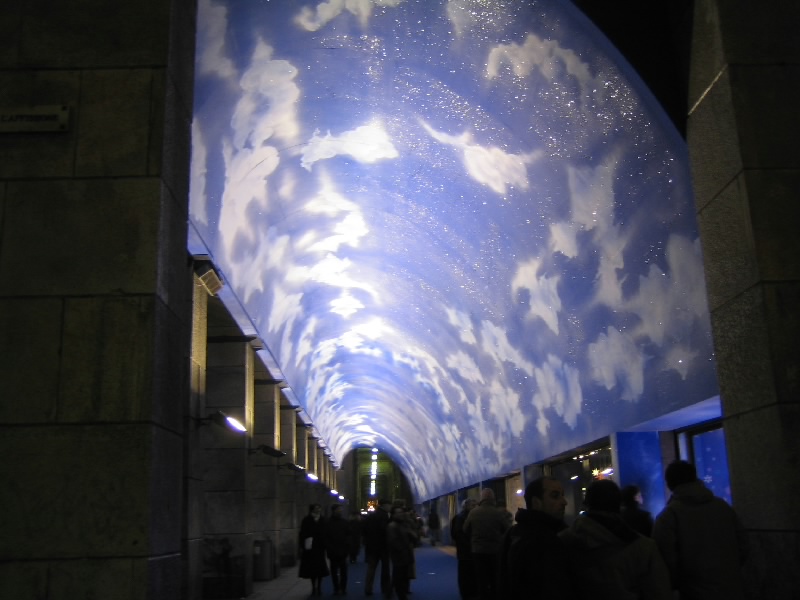 帰りはさらに寒くなったようだ。リナシェンテ前通路の屋根はきれいにライトアップしているが、空色ベースはちょっと寒々しいぞ。ラオターずは途中にあった売店で水を買っている。さて、ホテルに戻ろう。寒いと自然と急ぎ足になるな。ホテルに着き、フロントに聞くと明日の朝ごはんは7時からだそうだ。明日はフィレンツェに行くなど、いろいろとしたいことがあるのでちょっと早いが7時集合としましょう。どうせ時差ぼけで早く目が覚めるだろうしね。珍道中、初日はこうして無事に終了。おやすみなさい・・・