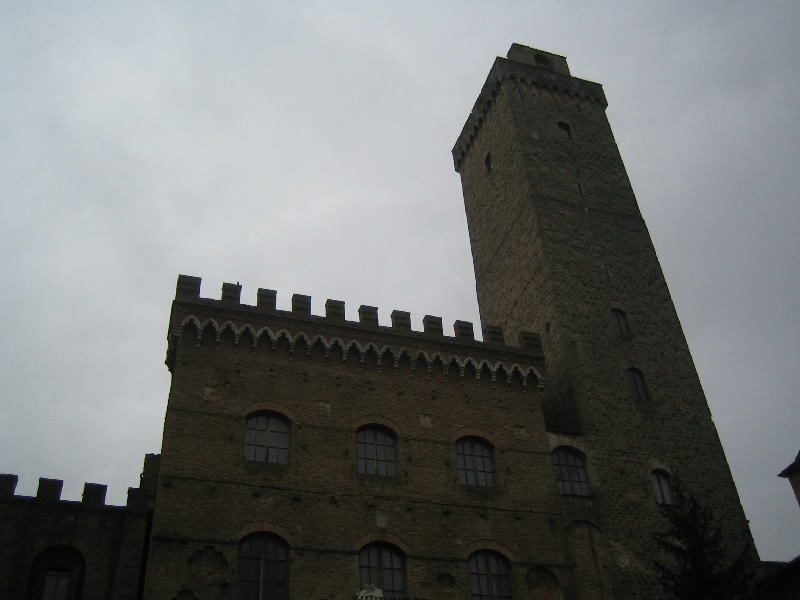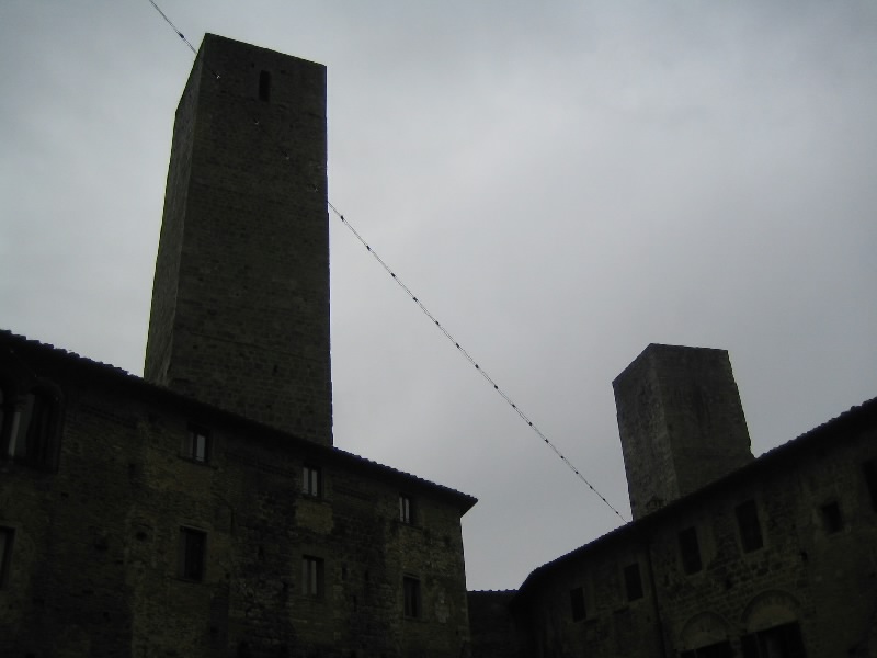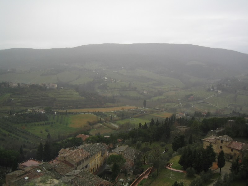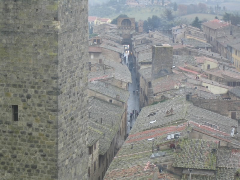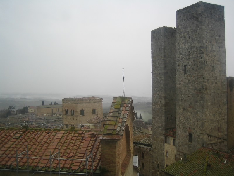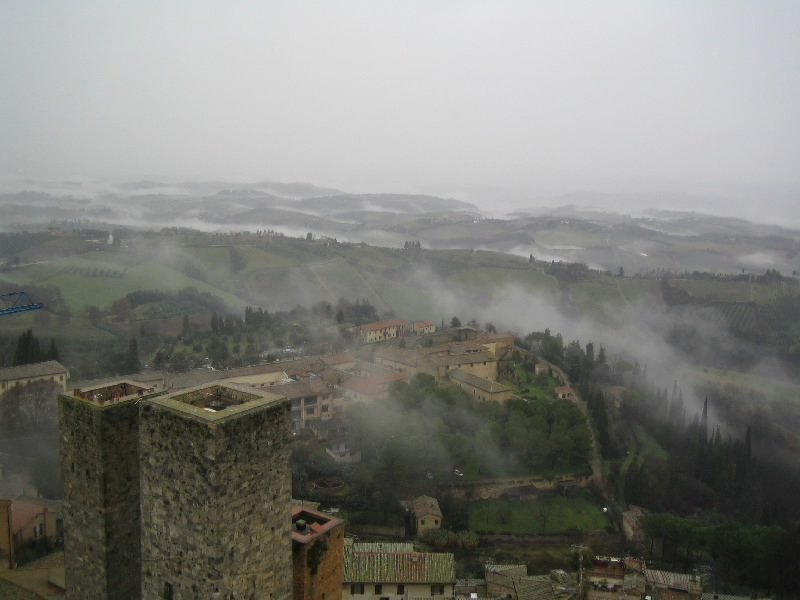 それにしてもこの階段。最初だけは石段を積み上げた造りだったのだが、塔を本格的に昇り始めるところからは鉄製の網目になった階段。別に何とも思わないのだが、網目から見えるはるか下の景色が高所恐怖症にはたまらないらしい。そうだったっけ?大騒ぎしながら、なんとか頂上まで到着。だれもいない頂上からは、サンジミニャーノ全体が見渡せる。残念ながら靄がかかっていて遠くの方はまでは見渡せないが、それでも雨に濡れた古い城壁の街を見下ろすのは気持ちがいい。車を停めた駐車場やホテルへの道、さっきまで歩いてきた道や広場などが手に取るように見える。今はそれほど多くの塔が見えないが、最盛期には70本を越える塔があったらしい。そんな頃にこうやって景色を見ることができたら、全く違うものになっているのだろうな。