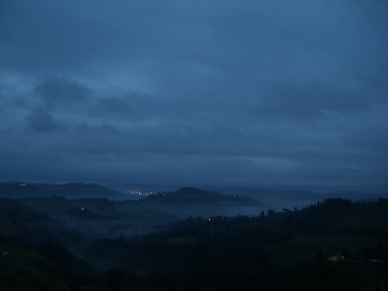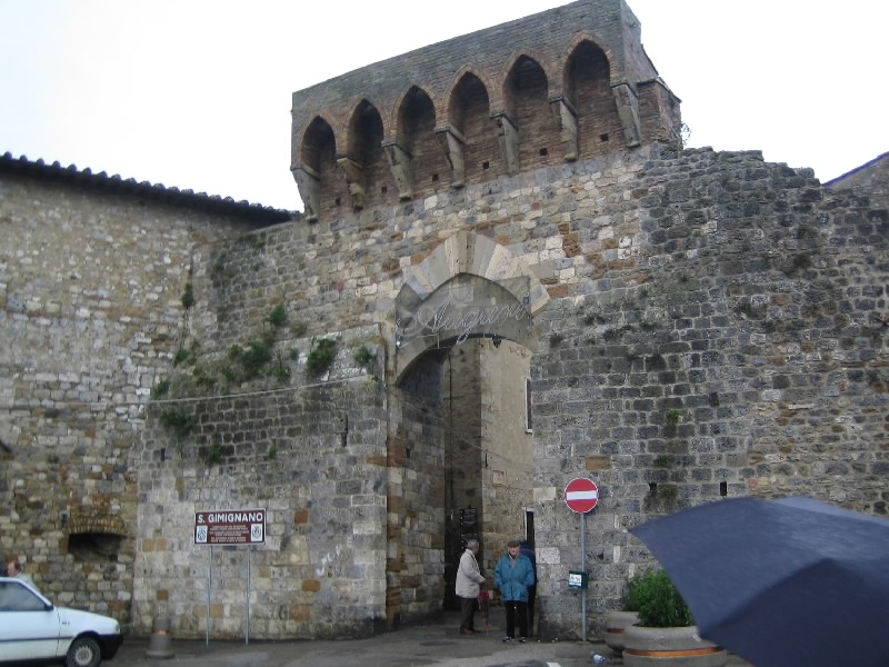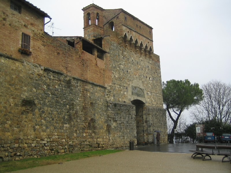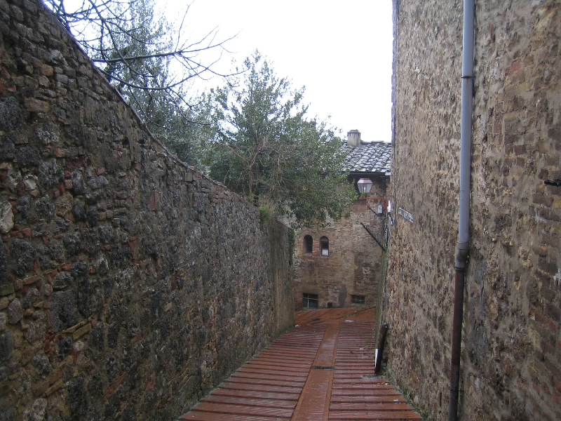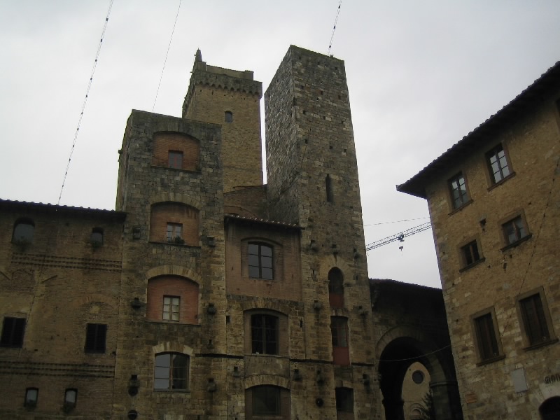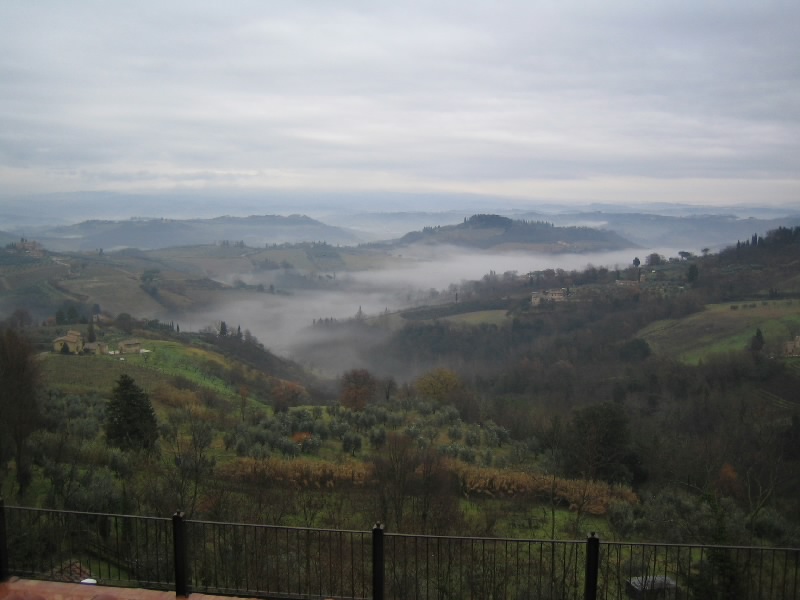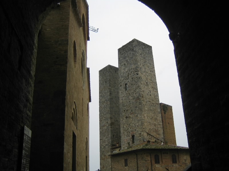 それにしてもこの階段。最初だけは石段を積み上げた造りだったのだが、塔を本格的に昇り始めるところからは鉄製の網目になった階段。別に何とも思わないのだが、網目から見えるはるか下の景色が高所恐怖症にはたまらないらしい。そうだったっけ?大騒ぎしながら、なんとか頂上まで到着。だれもいない頂上からは、サンジミニャーノ全体が見渡せる。残念ながら靄がかかっていて遠くの方はまでは見渡せないが、それでも雨に濡れた古い城壁の街を見下ろすのは気持ちがいい。車を停めた駐車場やホテルへの道、さっきまで歩いてきた道や広場などが手に取るように見える。今はそれほど多くの塔が見えないが、最盛期には70本を越える塔があったらしい。そんな頃にこうやって景色を見ることができたら、全く違うものになっているのだろうな。