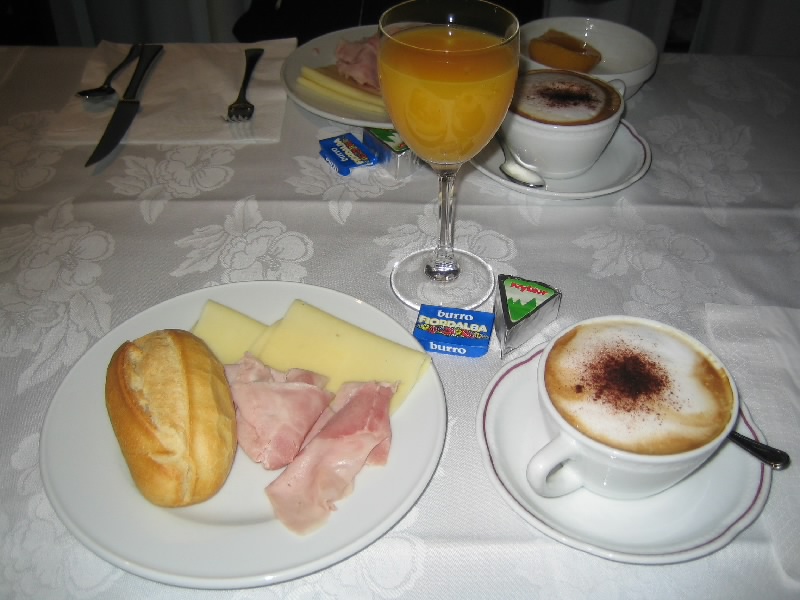 2006年元旦の朝。夜明け前に目が覚めたので外を見てみると、朝靄に煙っている。湿った冷たい空気がここちよい。まだ時間が早いので、もう一眠り。次に目が覚めたときは、もう明るくなっていた。でも少し雨が降っているようだ。シャワーを浴びて準備をしていると、朝ごはんの匂いがしてきた。8時半に朝ごはんに行くと、昨日と同じ場所に案内された。バイキング形式ではあるが、ハムとチーズのごくシンプルな朝ごはんだ。それぞれおいしいのでまあこんなものなのだが、果物か野菜か少し欲しいかな。オレンジジュースでビタミン補給。