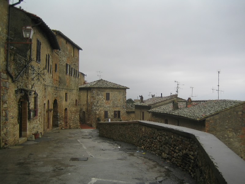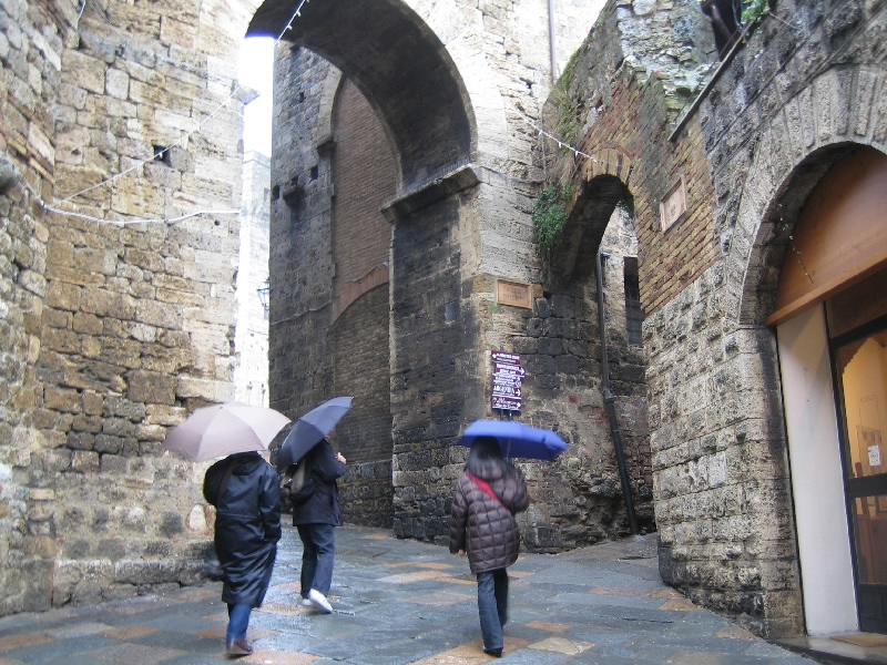 部屋に戻り、荷物を整理。チェックアウトして(661E)、荷物を預かってもらう。さて、新年のサンジミニャーノを散策しましょう。雨に濡れた石畳の道は、人通りも少なくなんともいい感じ。雨もなんとかおさまったが、傘無しは微妙につらい感じ。狭い裏通りや、一般家庭が並んでいるエリアなどを散歩するのだが、なかなかいい景色がいっぱいで、写真ポイントだらけだ。カメラは雨に濡らさないようにね。一旦城壁の外に出て見るのも景色が変わって面白い。ドゥオモ広場に向かう途中にあったのだが、雨なのに商品を外にぶら下げている革製品やさんっていうのはどうなんだろう。まあそこがイタリア人、雨に濡れても日光にあたっても、別に気にしてないのかな。