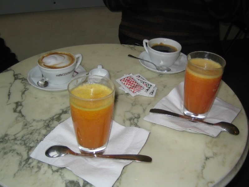 塔に登れるのは12時半からなので、しばらく広場に面したカフェで休憩。絞りたてのオレンジジュースはうまいねえ。きむ氏はエスプレッソに飽きてきたらしく、アメリカンを注文。とはいえ充分濃いコーヒーで、日本だったらこれがエスプレッソと言っても通じるほどだね。