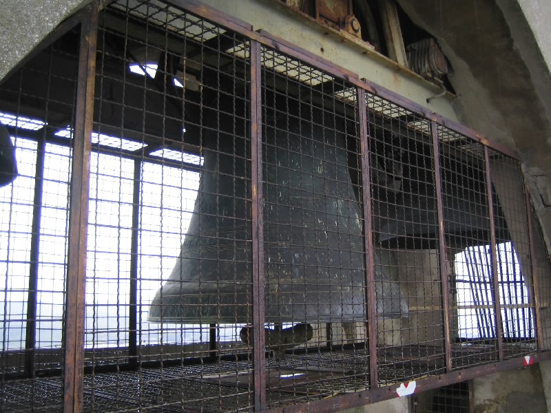 さて、12時半になった。塔に登りますか。少し階段を上がったところに受付があり、ここでチケットを買い(@5E)、荷物をロッカーに預ける。階段が狭いんだろうな。ここからはひたすら階段を上るのだが、ところどころ窓が開いているので外を覗くと次第に街全体を見渡せるようになる。レンガ色の屋根が、だんだんとミニチュアのように見え始めるのがおもしろい。地上では雨の中ということもあり、かなり重々しい雰囲気だったのに、上から見るとまるでイメージ中の中世ヨーロッパの景色が広がっている。
