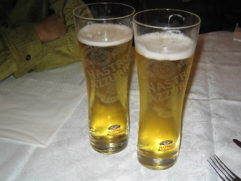 少し休憩して、街歩きへとでかける。とにかくまずは昼ごはん。ただもう4時なので、レストランが開いていない。カンポ広場に行ってみると、いくつかあいてそうなお店があった。一番手前のお店に入りましょうか。そこそこお客さんがいるようだ。おなかがかなり減っているし、ドライブで疲れたので久しぶりのビールで喉を潤しましょう。そしてパスタやサラダ、カプレーゼなどを頼む。みんなおなかがすいていたのか、がつがつ食べる。そして久しぶりの野菜サラダを、むさぼるように食べる。きむ氏はポルチーニが「シイタケの味がする」ということでNG。おいしいのにねえ。