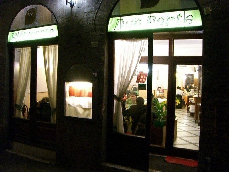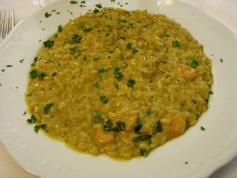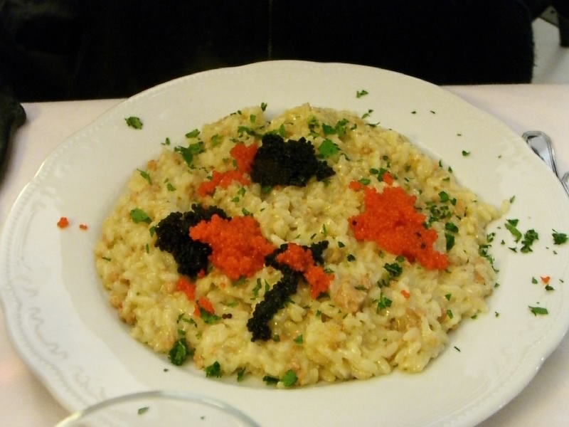 そろそろ8時半。部屋の前の廊下で集合だ。なんだか眠くて頭がぼーっとしているが、なぜかひとりだけハイテンション・・・ごはんとなれば元気だねえ。さて、晩ごはんに行きますか。昼が遅かったのでそれほどおなかが減ってはいないが、軽くなにか食べたいね。外にでると、やっぱり雨。さっき帰り道に見たレストランが良さそうだったので、行って見ましょう。お店の名前はDue Porte。半分くらい席は埋まっているようだ。席につき、メニューを見る。昼がビールだったので、夜は赤ワインにしましょうか。ゆっくりワインを飲んでいると、わりとすぐに料理が出てきた。ますは牛肉のタリアータ。薄く切った牛肉に、ルッコラとパルミジャーノ。フィレンツェで分厚い牛肉を食べたが、このくらいの量でちょうどいいな。ワインともちょうどいい感じだ。続いてリゾットが2種類。この旅で初のリゾット、久しぶりの米だ。魚卵ののったロシア風のリゾットと、エビの入ったカレー風味のリゾット。どちらもちょっと塩味が強かったが、おいしくいただく。