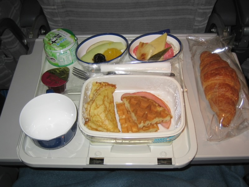 しばらくは日記を書いたりビデオを見たりしながら過ごす。そのうちに、軽食サービスがスタート。ピザパンか甘いパンかといわれてもねえ。でも今日はおにぎりをもってきているのさ。機内がわりと涼し目なので、温かいスープでほっこりしてからおにぎりタイム。うーんうまい。このパターン、いいなあ。JALも軽食をおにぎりにしてくれればいいのにね。その後しばらくはぼけぼけタイム。うとうとしながらのんびり時はたつ。暗かった外の景色が、ぼんやりと明るくなってきたようだ。飛行機は五大湖の一つ、ミシガン湖にさしかかる。しばらくすると、今度は到着前の朝食サービススタート。これは選択肢がない。ワッフルやクレープだが、下手にオムレツとかを出されるよりはずっとましな感じ。でも隣ではクレープの煮込んだリンゴが苦手だったようだが・・・ヨーグルトも十勝産で、シンプルに満足。食べ終わったころ、飛行機が気流の悪いところに入ったためにしばらく片付けができなかったようだが・・・仕方がないね。