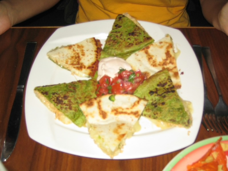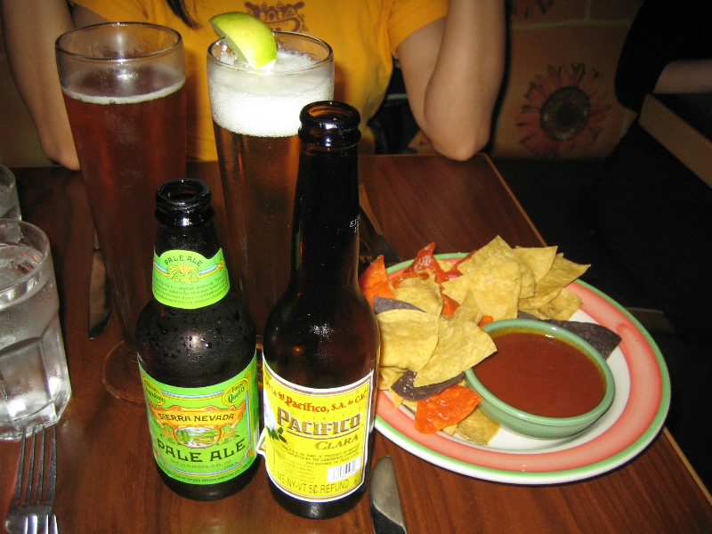 7時ごろ、目が覚めた。テレビを見ながら、しばらくぼけーとする。それほどお腹はすいていないが、晩ごはんにしないと。近くにメキシコ料理屋があるということなので、そこで何かたべましょうか、と思って行ってみると、なんと改装中のために休業中。ありゃりゃ。どうしようか。でも近くにいくつかカフェやレストランがあるので、ぶらぶらと見て回る。まあ今日は軽く食べられればいいので、最初に見たレストラン、CITRUSへと入る。けっこうにぎわっている。何がでてくるかよくわからないが、Appetizerと書いてある中から、エビのなにかとチキンのなにかをオーダー。あとはビールかな。せっかくなのでアメリカ産、PACIFICOとSIERRA NEVADA PALE ALEというのにしよう。突き出しに3色のチップスがでてきた。サルサソースにつけて食べる。よくあるとうもろこしのチップスだな。ビールとともにつまんでいると、料理登場。何これ?想像していたものとはまったく違う、ピザのようなクレープのようなもので、それぞれエビと鳥肉をはさんだものがでてきた。エビのほうはワカモレペースト、鳥肉のほうはチーズクリームをつけながら食べるらしい。エビの方はまだしも、鳥肉のほうは中にもチーズがたっぷりでボリュームたっぷり。これがAppetizerといわれてもかなり厳しいものだが・・・おいしいんだけどね。さすがに全部は完食できず($43.35)。いきなりアメリカの洗礼だな。