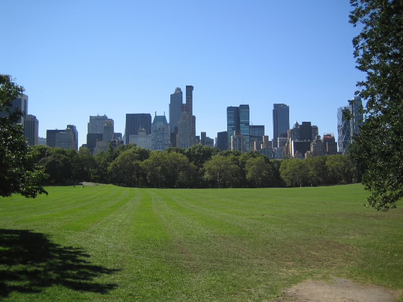 その向かいには、ジョンレノンがかつて住んでいたと言うダコタハウスがある。市内観光ツアーらしきたくさんの人が、建物を見上げている。さて、公園に入りましょう。ここセントラルパークは東西800m、南北4kmにわたるニューヨーク市民の憩いの場所。ジョギングをしている人や犬の散歩をしている人など、みな思い思いに楽しんでいる。しばらく歩くと芝生が広がっているところがある。ここはシープ・メドウという場所で、その名の通りかつては羊が放牧されていたらしい。今では芝生の向こうに高層ビルが立ち並ぶ、いかにもニューヨークといった景色。ここは11時にならないと開かないので、あと20分くらいなので待とうと思っていたが、丁度この数日は芝生の育成中で中には入れないらしい。残念。仕方がないので近くのあった芝生の場所で、朝ごはんタイム。他にも芝生に寝そべっている人や赤ちゃん連れの人などがいるぞ。さて、頂きますか。さっきZABERSで買ったサンドイッチを食べる。天気もいいし、静かだし、こんな公園でのごはんは気持ちがいいね。食後は公園を散歩。それにしても広い公園だ。野球ができるところもあるし、サイクリングをしている人もいる。しばらく歩くと、公園の出口。コロンバスサークルと呼ばれるこの場所の目の前には、あの大富豪、トランプ氏のトランプ・タワーがある。それにしても公園のすぐ横にはいきなりの摩天楼。これぞまさにニューヨークにいるという感じだ。