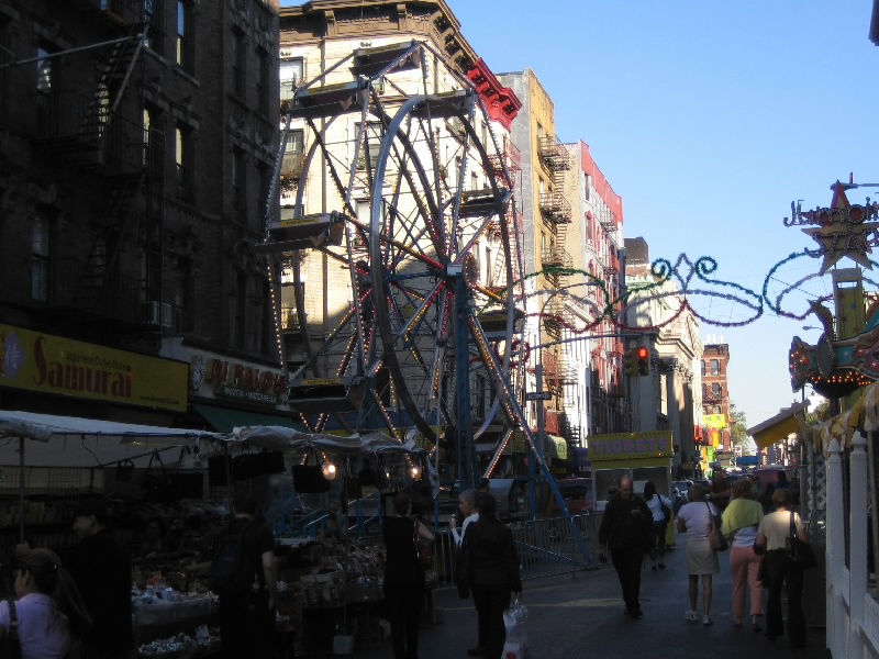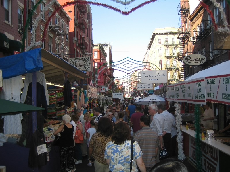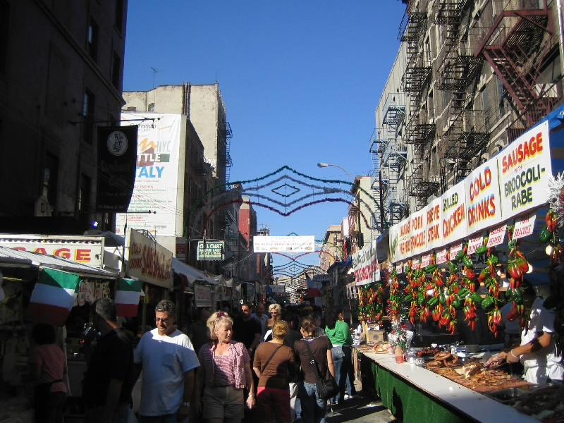 食後はリトル・イタリーへ。チャイナタウンのすぐ北側がリトル・イタリーというエリアで多くのイタリア料理店が集まっている。9/19を中心とした2週間はサン・ジェンナーロ祭が行われており、ちょうどその真っ最中。道の両側には、たくさんの屋台が並んでいる。さすがに今は満腹なので何もいらないが、ソーセージやジェラートなどが売られている。でもあのソーセージ、どうみてもでかいよね。やっぱりアメリカンサイズですか・・・それにしてもニューヨークの一角で、これほどまでにイタリア人の集まっているエリアがあるのは不思議な感じ。このお祭通りは300メートルはゆうに続いただろう。まあ特に買うものも食べるものもないのだが、雰囲気は楽しみました。ふう、ちょっと疲れた。まだ時差ぼけもあるしね。Bowery駅でメトロにのり、ホテルまで戻る。ちょっと休憩。
