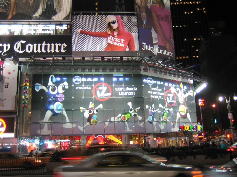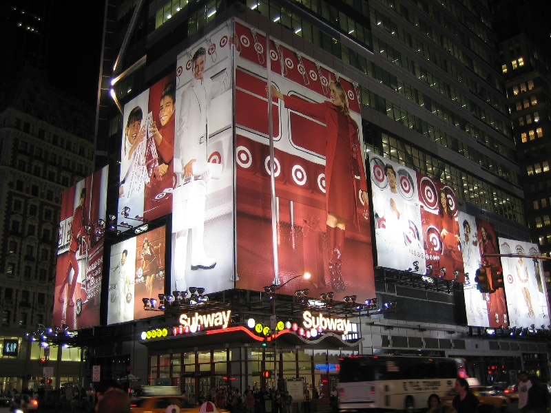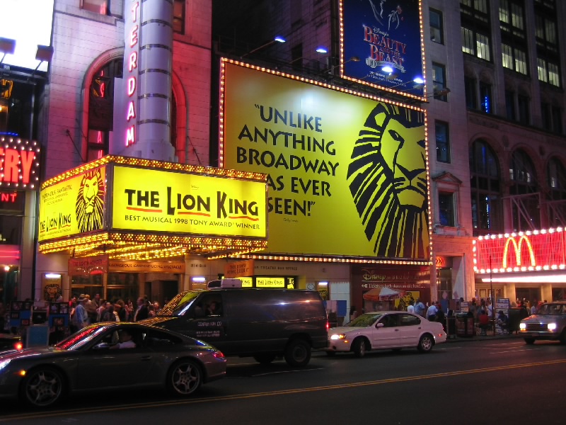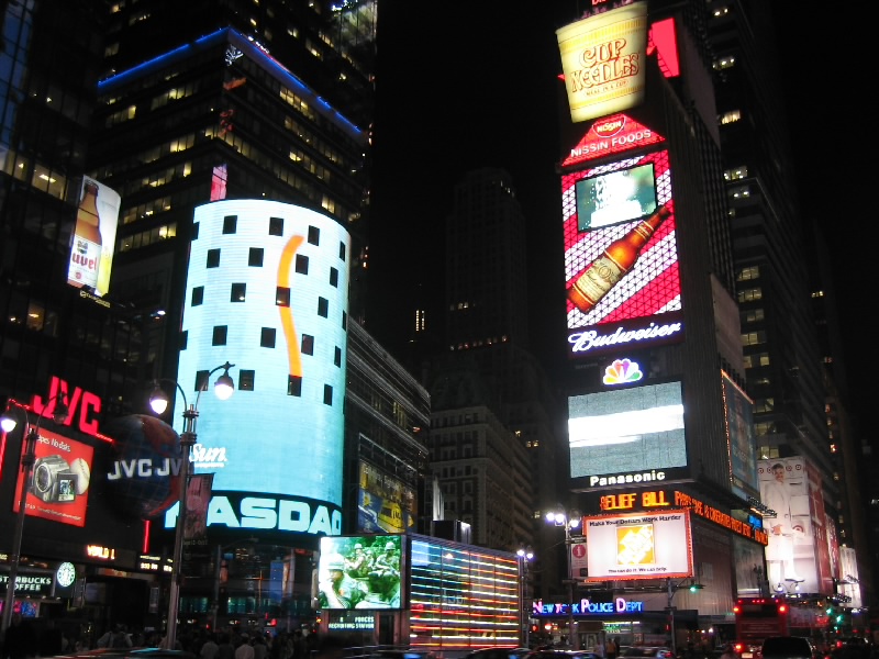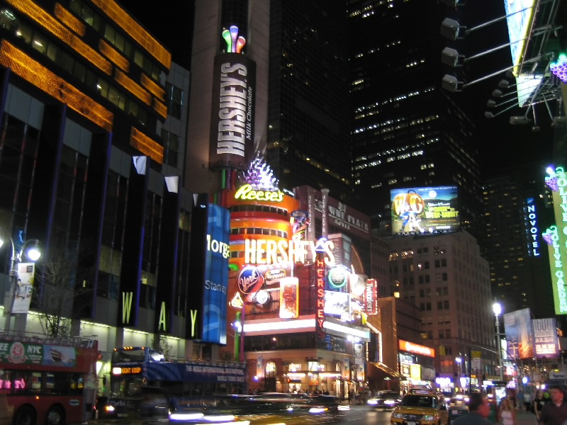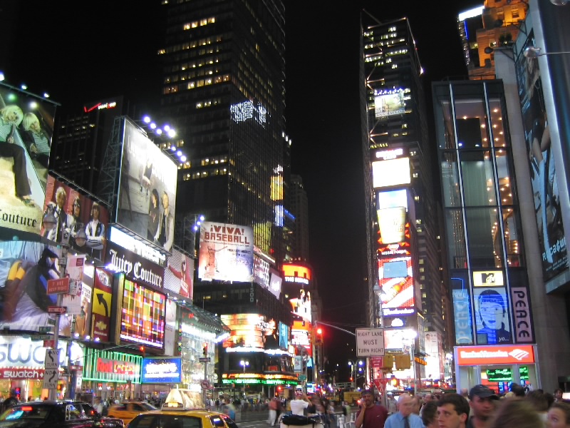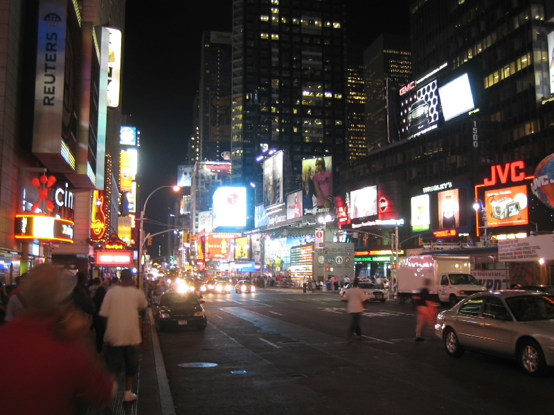 ふう、すっきり。もう7時を回り、外もすっかり暗くなっている。さて、それではタイムズスクエアに行きましょうか。72丁目駅でメトロにのるとたまたまそれが急行で、なんと次の停車駅がタイムズスクエア。あっという間に着いてしまった。地上にでると、そこはいわゆるブロードウェイ。まばゆいばかりのネオンサインの中に、数多くのミュージカルシアターの並ぶ華やかな場所だ。ライオンキングや美女と野獣、マンマ・ミーヤやオペラ座の怪人など、ロングランを続けるものもあればもっと小規模なものもある。今回はどれも見なかったが、また機会があれば見たいものだ。タイムズスクエアにはたくさんの電飾広告があるのだが、以前よりも液晶ディスプレイのものが増えたため、より明るく動きのあるものが増えた気がする。こうして毎日毎日、ここではたくさんのミュージカルやショーが行われているのだ。ここがもっともニューヨークらしい場所のように感じる。
