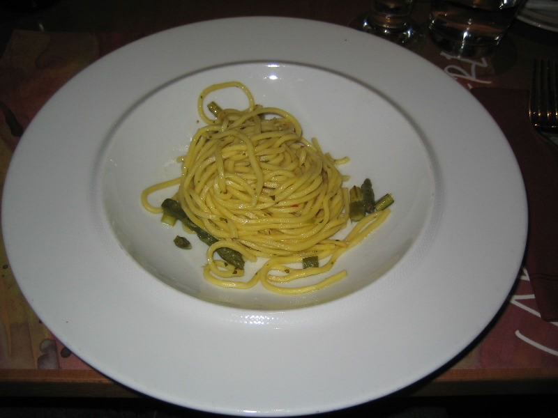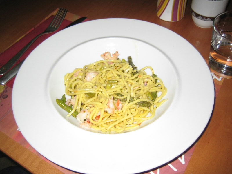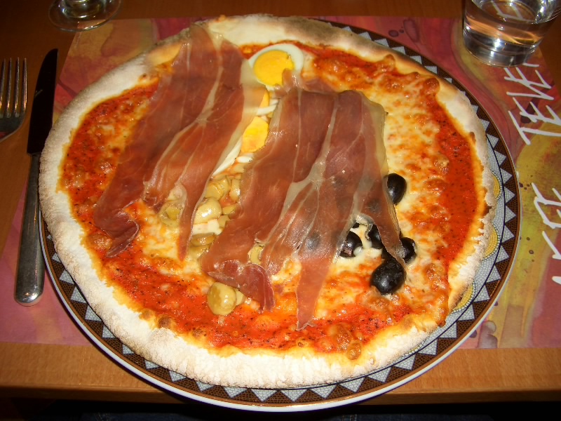 しばらくして、パスタ登場。これはなんだ?2皿同じパスタを頼んだのだが、どうみても具のバランスが悪い。特に海老が、片方にはたっぷりはいっているのにもう片方にちは一つも入ってないぞ。パスタの量も違うし・・・うーん洗礼。まあ分けてたべればよい。ボンゴレもまあまあかな。ピザはカプリチョーザなのでオリーブや生ハム、卵など具がふんだんだ。それとサラダを2皿頼み、わけて食べる。すべて分けながら、まさに日本人食べ。効率的で経済的だよ。