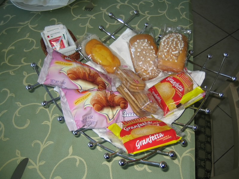 朝ごはんは一階のレストランで。ところがまったく人の気配がない。でも3つのテーブルにはすでにパンが用意されているので、これだろうな。ジュースをグラスについでいると、ホテルの人が来た。カプチーノでも頂きましょう。パンは袋入りのものだが、なかなかおいしい。ゆったりとあさごはんを楽しむ。それにしても、昨日はあんなにたくさんの人がいたのに、このあさごはんの様子を見ると宿泊客はわれわれだけ?日本以上に休日と平日が極端だな。