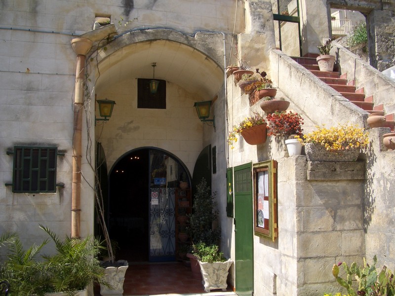 では中に入ろうか。洞穴住居群の周りの道をぐるっと行くと、広めの駐車場があった。停めてみるが、周りになにもなさそうなのでもう少し先へ。レストランやカフェがあるエリアの近くに停めましょう。さて、昼ごはんにしましょう。近くのトラッテリアに入る。外は日差しがきついが、中に入るとひんやりとしている。しかも目が慣れるまでは、店の中の様子がよく分からない。しばらくして目が慣れてくると、ここは岩をくりぬいた、いかにもサッシ風のお店であった。