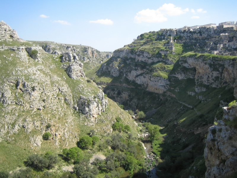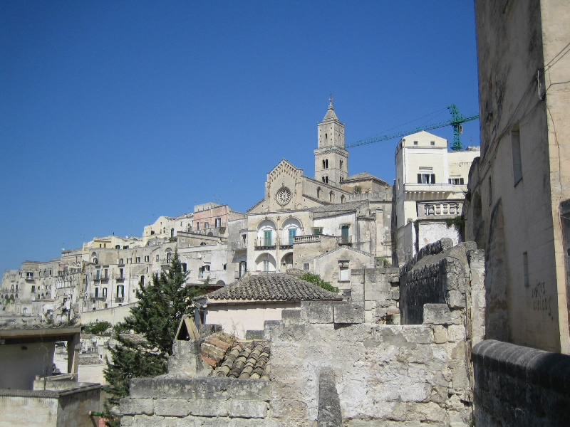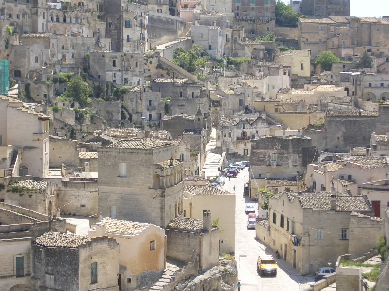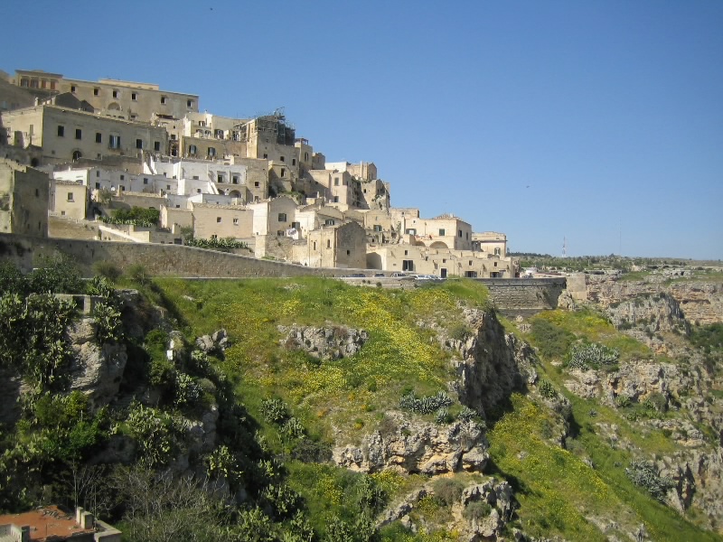 部屋に戻り準備をして、チェックアウト(240E)。なかなかいいホテルでした。ホテルの前では親父が車の準備をしているが、どうやら片道の無線ができるようになったようだ。ということで、親父号の助手席の弟が、何かあったときは俺号に合図を送ることができるようになったのだ。アルベロベッロやチェザーリオとは違い、今日からは行ったことのないところへ行くわけなので、これは心強い味方になるだろう。10時少し前、マテーラにむけて出発だ。ポルトチェザーリオを出て、まずはターラント方面へと走る。BGMは浜崎あゆみベスト。途中、赤い芥子の花がとてもきれいなところがあった。しばらくして、例のMANDURIAに到着。ここはすっと抜けるはずが、標識に従って走っていると妙に町の中の狭い道をうろうろと走ることになってしまった。うーん、なぜなんだろう。行きも帰りも要注意な街だ。でも何とか広い道に出てきたぞ。ここは7terなのでしばらくはターラントに向けて快調に走る。だんだんと街の景色になってきて、道も広くなり車も増えてきた。ターラントをこえたら今度はバーリ方面へ。ハイウェイのような道を少し行くと、AutostradaA14号との分岐が。数日まえ、ローマからこの近くまで一気に来たわけね。ここを越えると、マテーラ方面の出口を発見。ここは標識通りに進む。Autostradaの下をくぐり、快調に走る。途中、Castellanetaという街ではちょっとぐるぐるしたが、それでも標識通りに進んでいるとまた広い道に出てくる。分かりやすいような、分かりにくいような不思議な感じだが、迷っているわけではないのでまあいいか。街から離れると、すごく快適な田舎の一本道だ。サザンのベスト3枚目をBGMに北海道の美瑛にも似た感じの景色を走る。ただ問題は、小さな虫がフロントガラスやボンネットに次から次へとぶつかること。なんだかいろんなものがこびりついているぞ。雨でもふって洗い流してくれないかな。ま、今日はこのまま晴れていてね。しばらく走ると、マテーラ市内への標識が出てきた。