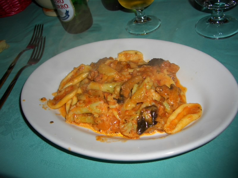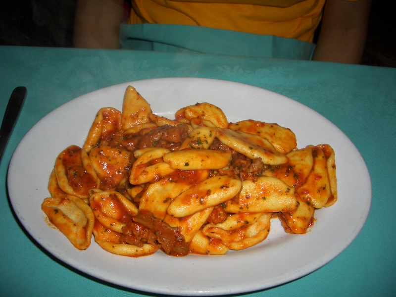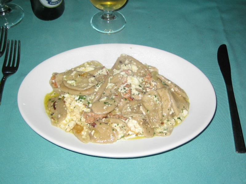 まずはビールで乾杯。こういうときのビールは実にうまい。このお店にはパスタが7種類あるのだが、ゴルゴンゾーラのパスタ以外のものを6種類注文。お店にしてみれば一度に作れないからめんどくさい話だよね。はるばる日本から来てるのだ、許しておくれ。さすがに6種類一度にはできないようで、2種類ずつくらいで出てくる。せっかくなので例によって順番にまわして食べる。うん、どれもうまいね。オレキエッテが大きくなったようなパスタや、ちょっと太目のスパゲティなど、変わった感じのものもある。いろいろ食べて、満腹です。(60E)