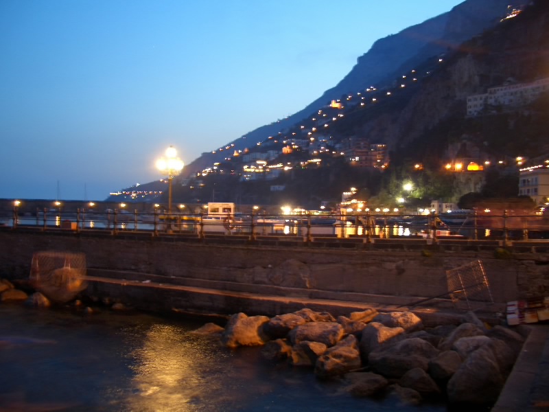 高速をおり、市内に入る。するととたんに信号、人ごみ、交差点。リゾート地らしく、観光客らしき人がたくさんいる。さあて、市内の抜け方がわからないぞ。とりあえず中心街に向かって走り、海を目指す。海沿いにでたあとは、モーニング娘。ベストをBGMに海岸沿いを西へ西へ。すると、アマルフィ方面の標識がでた。あとはひたすら海岸沿いを進むのみだが・・・これが大変。断崖絶壁にへばりつくように作られた道を行くのだが、こんな道でも抜かそうとする車がたくさんいるのだ。対向車も結構来るし、おまけにバスも来るし、狭いし、危ないよ。途中VietriやMaioriなど、いくつか街を抜ける。それぞれがリゾートエリアなので、目的地のアマルフィに着いたかな、と思ったら違う街、を繰り返す。そんな街をいくつ抜けただろうか、標識によるとようやく次がアマルフィらしい。でも駐車場の場所と入り方が分からず、つい通り過ぎてしまった。仕方がないので途中でなんとかUターンし、やっとのことで無事にアマルフィ到着。へとへとだ。思わず親父と握手だ。なんとか暗くなる前に到着できてよかった。いやいや、それにしてもよかった、オートマで。この道マニュアルは絶対無理。うーん、マニュアルで走破した親父はすごい。