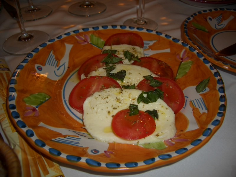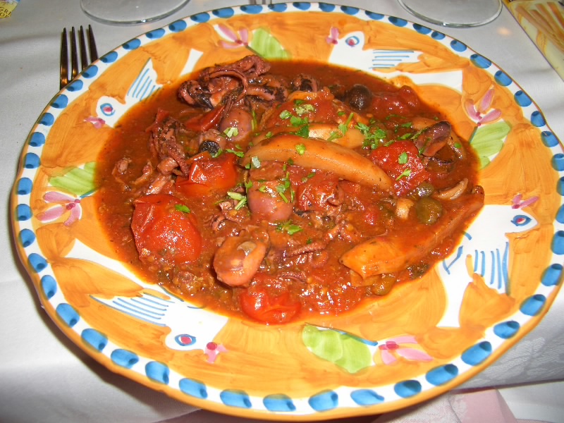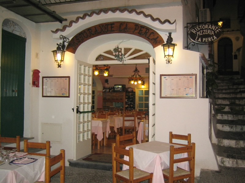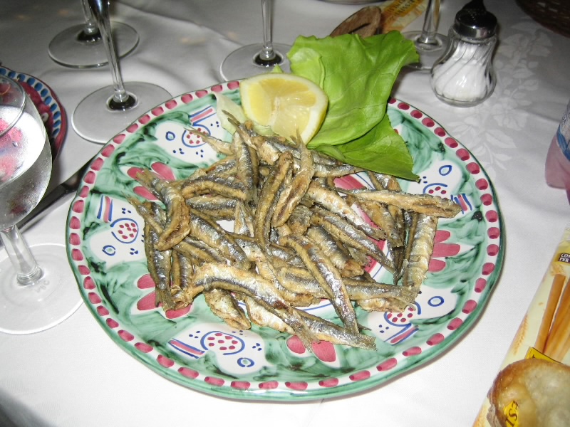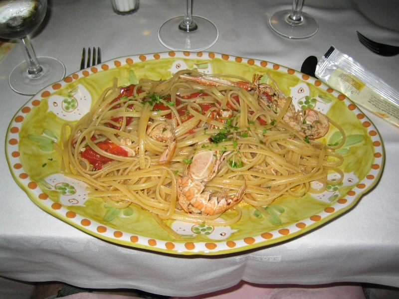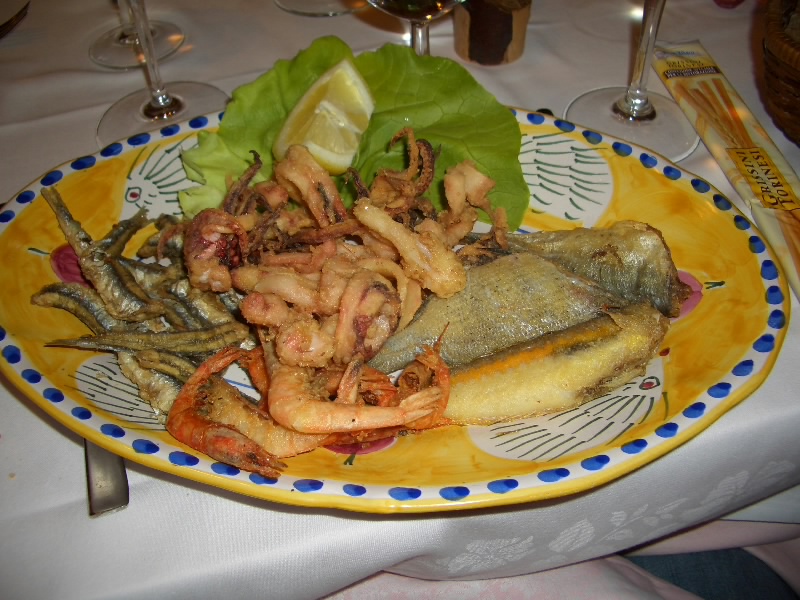 さあて、どこに行きましょうか。ざっと下見をしてから、みんなで出かけよう。どこにお店があるかよく分からなかったのが、広場から奥へと向かうにぎやかな通りがあり、その脇にある細い階段道をあがっていこう。登りきったところに狭い裏通りがあるのだが、この道沿いにいくつかレストランがあり、いい感じに賑わっていてよさそうだ。ぱっと見の雰囲気で、PERLAというリストランテに入る。席はかなり埋まっていて賑やかだが、ちょうど6人が座れるテーブルが空いていてラッキー。さて、何にしましょうか。今日は長距離ドライブでおなかが減ったし、ワインもしっかり飲みたい気分。メニューから前菜やパスタ、メインなど、いろいろ頼む。さあて、次々とでてくるぞ。まずはカプレーゼ、イワシのフリット、カジキマグロのスモークという前菜軍。いやあ、どれもうまいねえ。特にイワシ、これは新鮮なんだろうなあ。ワインに合うし、実にいい。お皿もカラフルで、楽しいぞ。続いては魚介のフリット。エビもイカも魚も、オリーブオイルでカラッと揚がっている。レモンを絞ってごきげんさ。そしてパスタ。ボンゴレロッソも魚介のリングイネも、6人いるといろいろ食べられていいなあ。でもちょっとずつになるので、ものによってはもうちょっと食べたい気持ちもあるんだけどなあ。