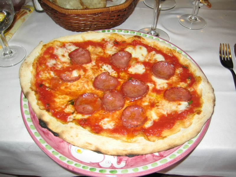 次にはメイン系のエビのグリルとイカのトマト煮が登場。日本で普通に食べるエビのグリルはちょっとパサパサしてあまり好みではないのだが、これは新鮮なのだろう、身がプリプリでジューシー。どういうこと?イカのトマト煮はイカ風味満載の一品で、イカ好きにはたまらない味だ。それにしても、ちょっとずつだとあっという間に食べてしまうなあ。でもさすがに満足してきたが、最後にもう少し食べたいということで、サラミのピザでしめる。ちょうど一切れずつでいい感じだ。(122.5E)