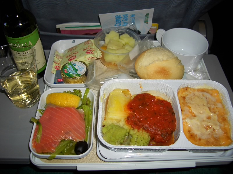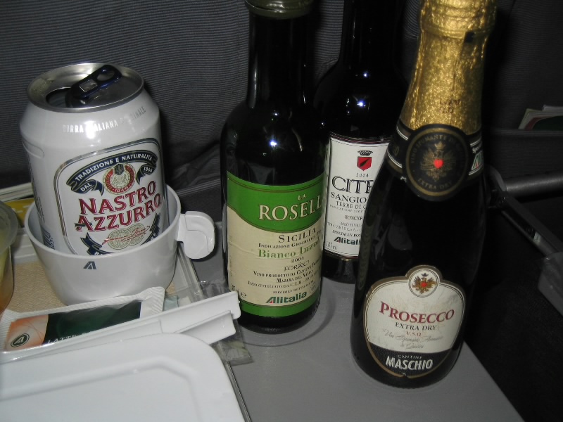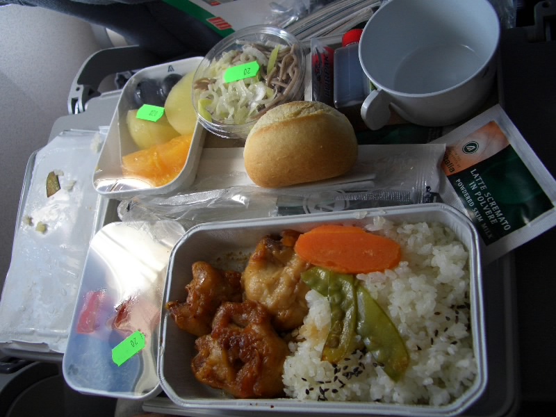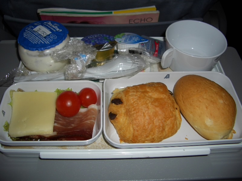 行きはJAL機材だったが、帰りはアリタリア機材。ドリンクはスプマンテからビール、赤白ワインといろいろ楽しみましょう。機内食も前菜、パスタ、メインがはっきりと分かれており、ワインにもよくあう内容だ。やっぱり距離の長い路線は機内食をゆっくり楽しみたいよね・・・食後はゲームをしたりビデオを見たり、うとうとしながらのんびり過ごす。どのくらいたっただろうか。飛行機はそろそろロシアを抜ける頃。ここで到着前の朝食サービス。ハムとチーズ、パンとヨーグルトの簡単な食事ではあるが、機内でぼーっとした体にはこのくらいがちょうどいい。