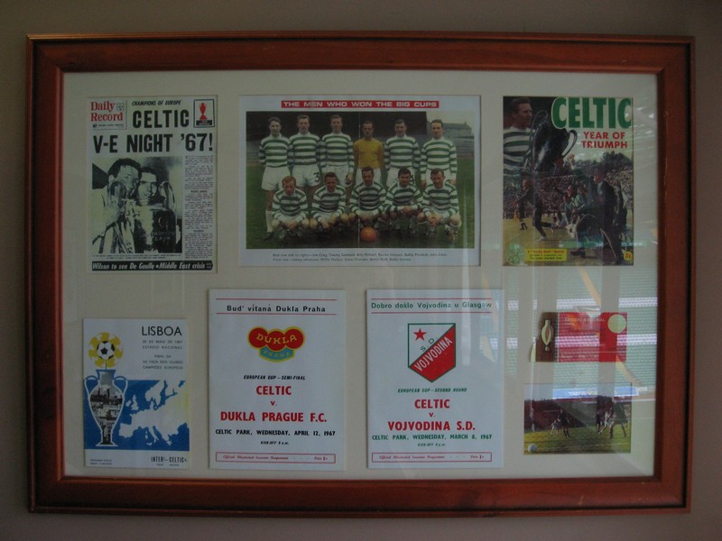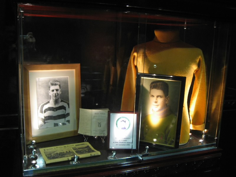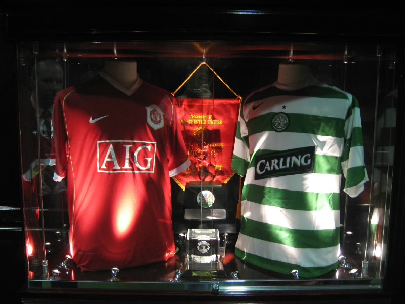 まずは栄光の歴史を納めたトロフィーやカップの数々。スコットランドリーグでの栄光もさることながら、やはり1967-68シーズンのチャンピオンズカップによる欧州制覇、これが最も誇れる歴史なのかな。燦然と輝くビッグイヤーにしばし見とれる。われわれの生まれた年だと告げるとクリスさんは笑っていた。隣の部屋には、11月に行われたチャンピオンズリーグ、対マンチェスターユナイテッド戦の勝利を記念した展示があった。あの試合で俊輔がフリーキックを直接決め、チャンピオンズリーグになってからは初めてセルティックが決勝リーグ進出を決めたあの試合だ。次の相手はミラン、是非とも勝ち進んでもらいたいものだ。その横には往年の名プレーヤーで、1931年に試合中の事故で22歳で無くなったジョン・トムソンを偲ぶ展示がある。今もセルティックサポーターの中には伝説として存在し続けるゴールキーパーなんだろうな。