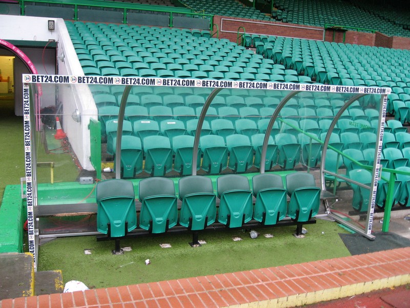 階段を上がり、扉を開けると目の前には誰もいない緑のピッチ。昨日試合があったところとは思えないくらい、静寂に包まれている。バックスタンドの座席の色と、白抜きされたCELTICの文字そして緑のピッチがなんとも美しい。ピッチへと降りてみる。今朝も雨が降っていたので湿った感じがするが、水はけはいいんだろうな。ピッチからのスタンドを眺めたり、ベンチの写真を撮ったり、しばし時を過ごす。完全なプライベートツアーなので、クリスさんがわれわれ2人の写真をどんどんと撮ってくれる。いつもはたくさんの人と一緒なので、なかなか撮れないんだけどね。