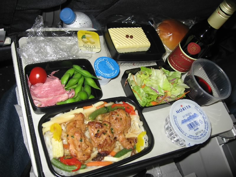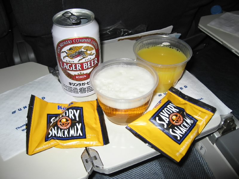 例によっていつのまにやら空の人。座席が2-5-2なのだが、真ん中の5が4になるところの席の通路から2席。なのでパーソナルビデオが半分ずれていて、妙な具合だ。まあとくに見たい映画もないし、ゲームもないからいいんだけどね。まずは最初のお楽しみ、ドリンクタイム。ビールとオレンジジュースで、空の旅に乾杯だ。JALとは違うおつまみが、新鮮でいい。その後しばらくして、機内食タイム。ビーフかチキンかの選択。どちらでもいいのでそれぞれ食べよう。ビーフはいかにも機内食にありがちな感じのマッシュルームソース。チキンは中華風で、米の麺がついている。いずれも付け合わせの野菜がちゃんとあり、なかなかのもの。あまり期待していなかった分、どちらもしっかりと楽しめました。ワインが赤しかなかったのがちょっと残念ではあるが・・・でも枝豆が妙においしかったかな。最近アメリカではやっているらしいしね。おなかも落ち着いたところで、あとはうとうとしたり本を読んだり。飛行機はひたすら海の上を飛び続ける。