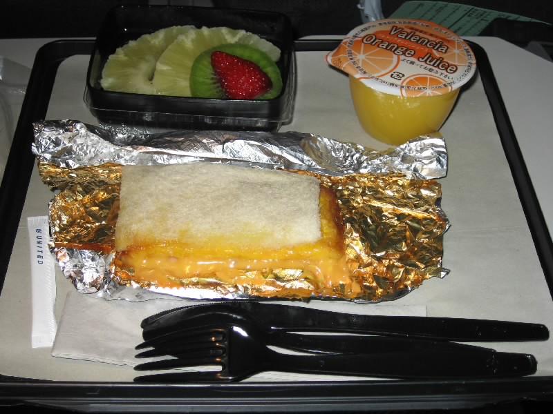 いつのまにやら8時間程経過し、運行地図にもサンフランシスコの表示が出るようになってきた。そんなところで軽食タイム。配られたものは・・・これはホットサンドだな。ハムとチーズと卵がパンに挟まっており、結構熱い。これがシンプルで、なかなかおいしくいただけました。付け合わせの果物も結構みずみずしいし。JALのソーセージパンや、ボンゴレといなりよりはよっぽどまし。こんなくらいでいいのかもね。その後次第に高度を下げていく。定刻より少し早く、現地時間3日朝8時半にサンフランシスコ国際空港に到着。
