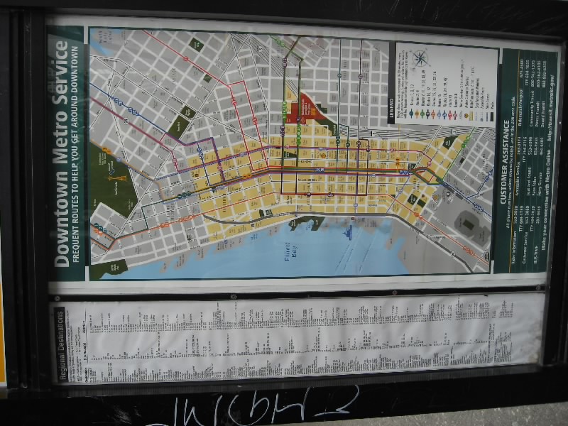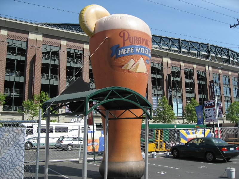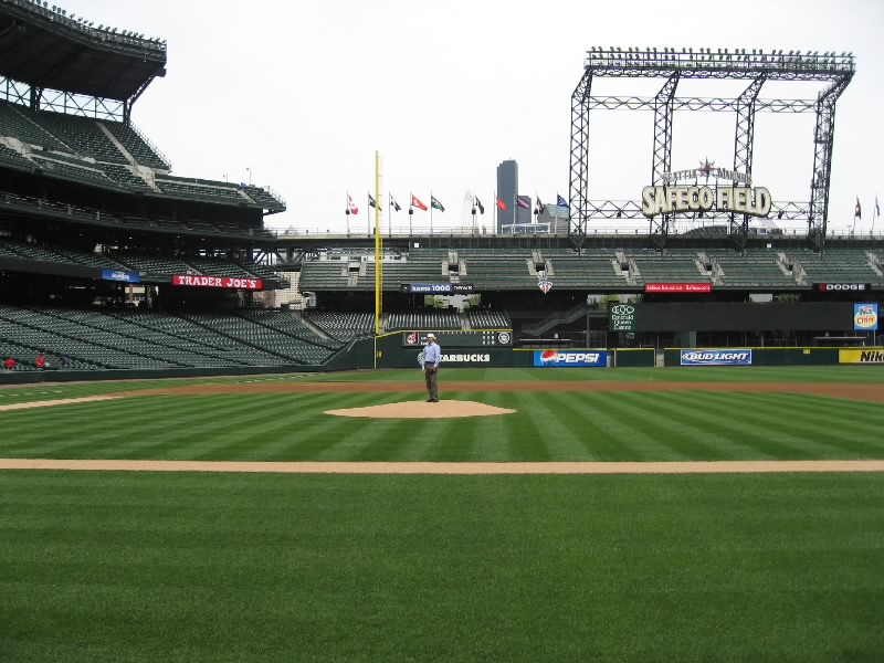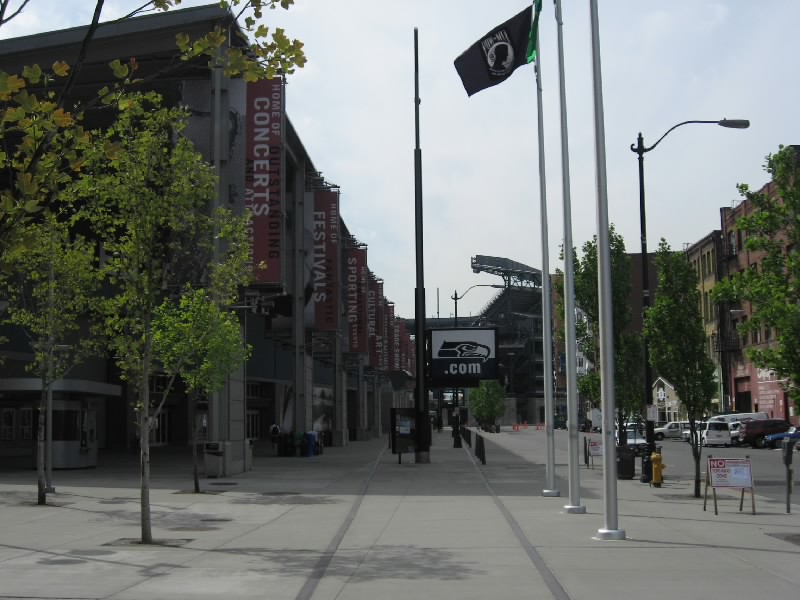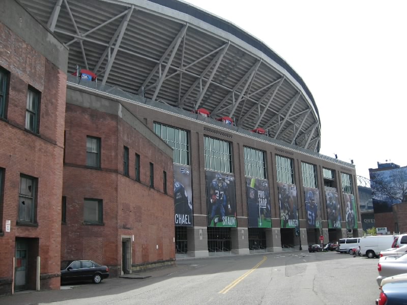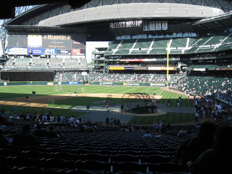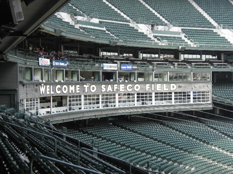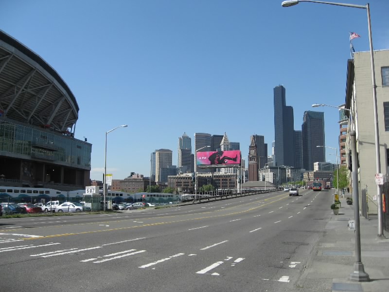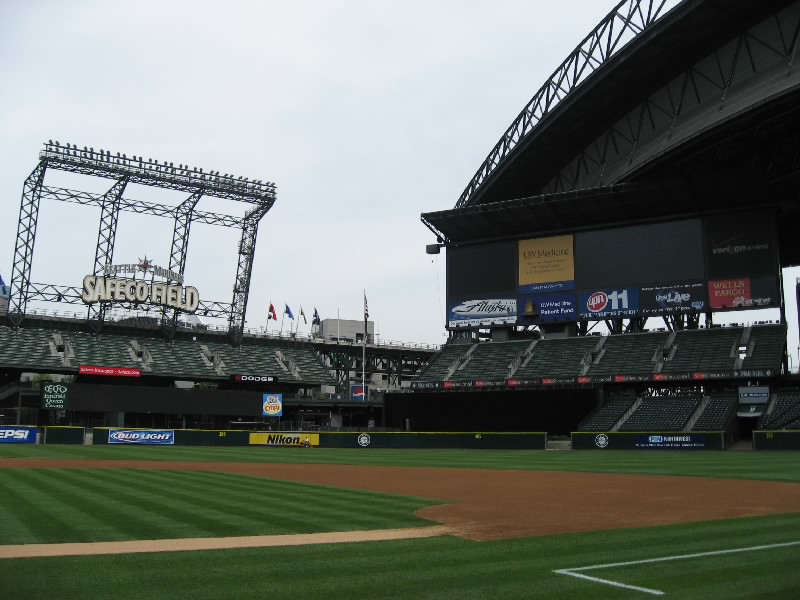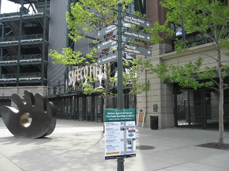 それではスタジアムへ出発だ。1番街まで行くと、マーケットの入り口近くにバス停があった。ここから出るほとんどのバスはスタジアム方面へと行く。しばらくすると、15番のバスが到着。これでいいぞ。メトロバスと呼ばれるこのシアトルのバスは、ダウンタウンはフリーライドエリアとなり、昼の時間帯はなんと無料。スタジアムはそこから少しはずれるが、そのぎりぎりまで乗って少し歩けばただで行けるのだ。なんとも、いいシステムだねえ。窓が割れにくいように網目状になっているので外の景色が見にくいが、KING通りを越えた最初の停留所で降りる。ここまでは無料、いいねえ。目の前にはもうスタジアムが見えているので、あとは数百メートル歩けばいいのだ。手前にあるアメフト用のクエストフィールドを過ぎ、やってきましたセーフコフィールド。シアトルマリナーズのホームスタジアムだ。