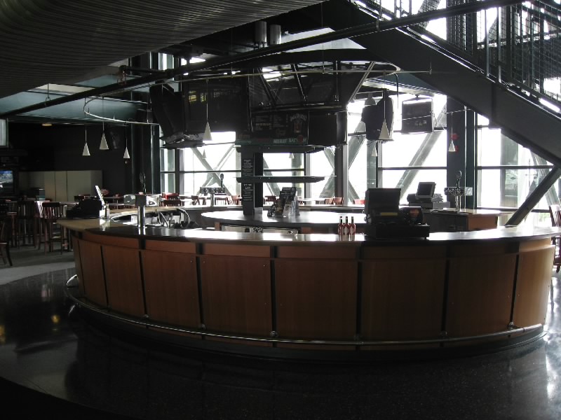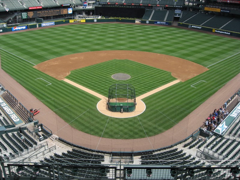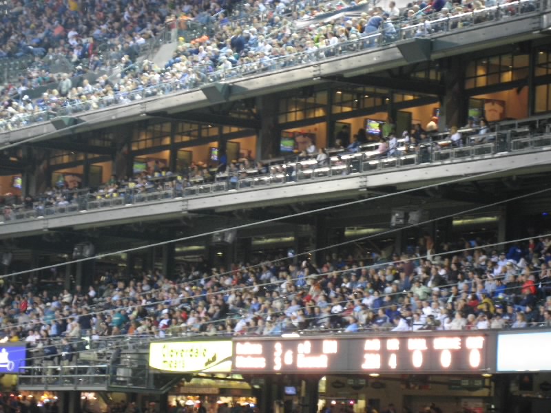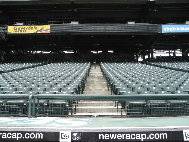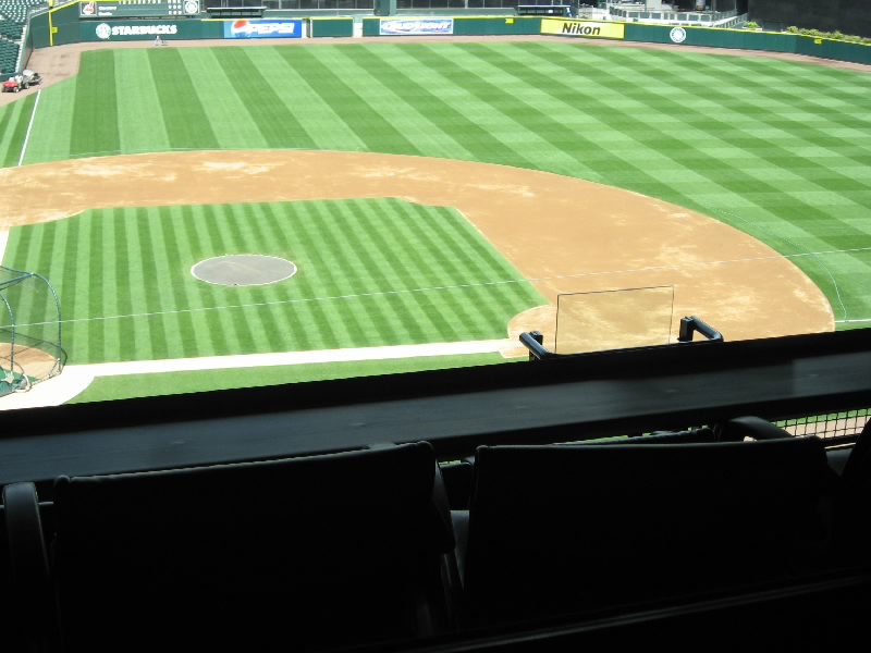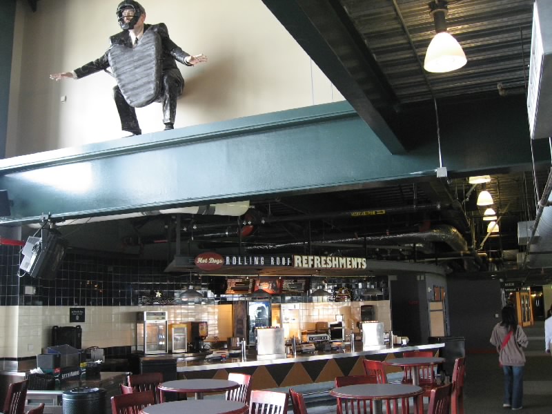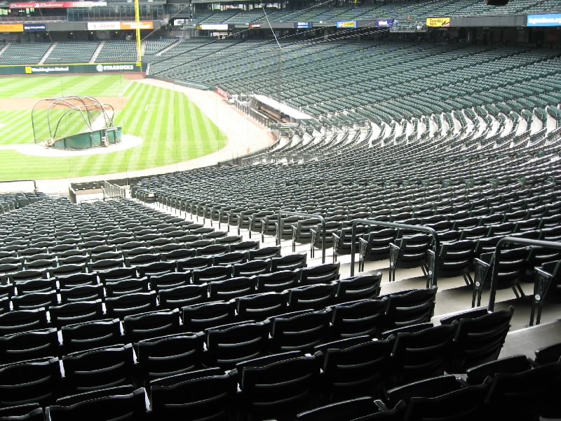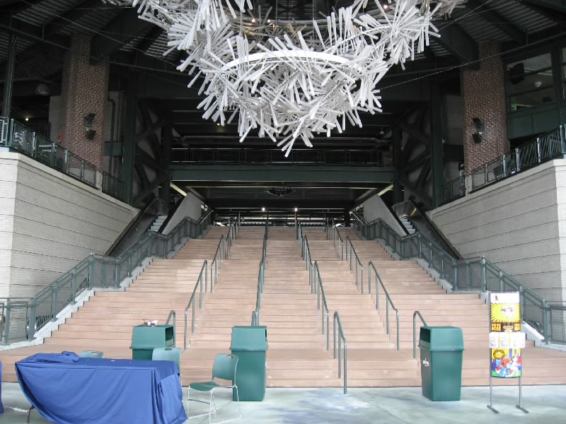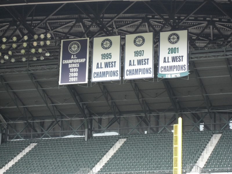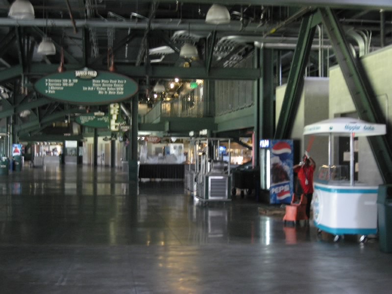 まずは目の前の壁に大きな絵が。これは1995年にマリナーズが西地区初優勝したときにの様子を表したものらしい。初優勝、盛り上がったんだろうなあ。その後1997、2001と優勝しているのだが、最近は調子が悪いねえ。さあ、広い通路に出てきたぞ。これは内野から外野までをグルッと回る通路で、どのチケットを持っている人でも自由に通行できるらしい。それいいねえ。それにしても、誰も居ない観客席は壮観だ。ゴミも全然落ちておらず、きれいな観客席だね。