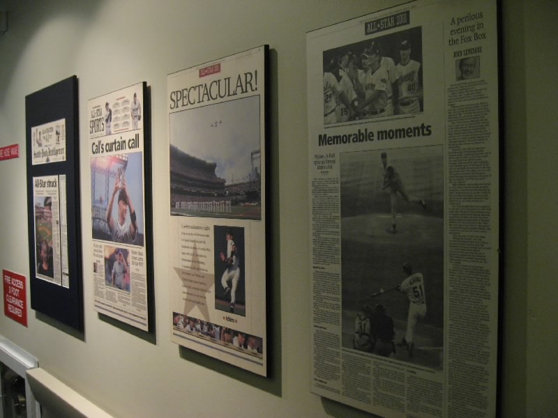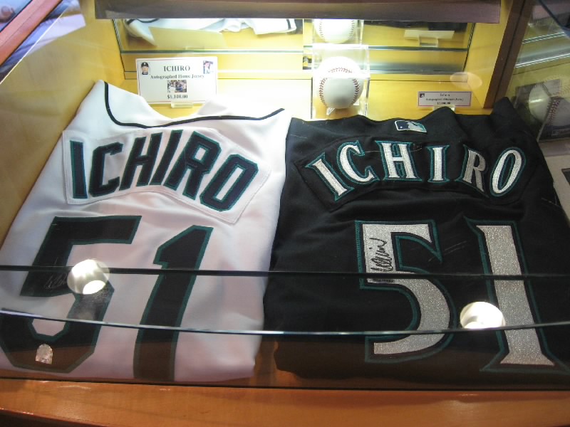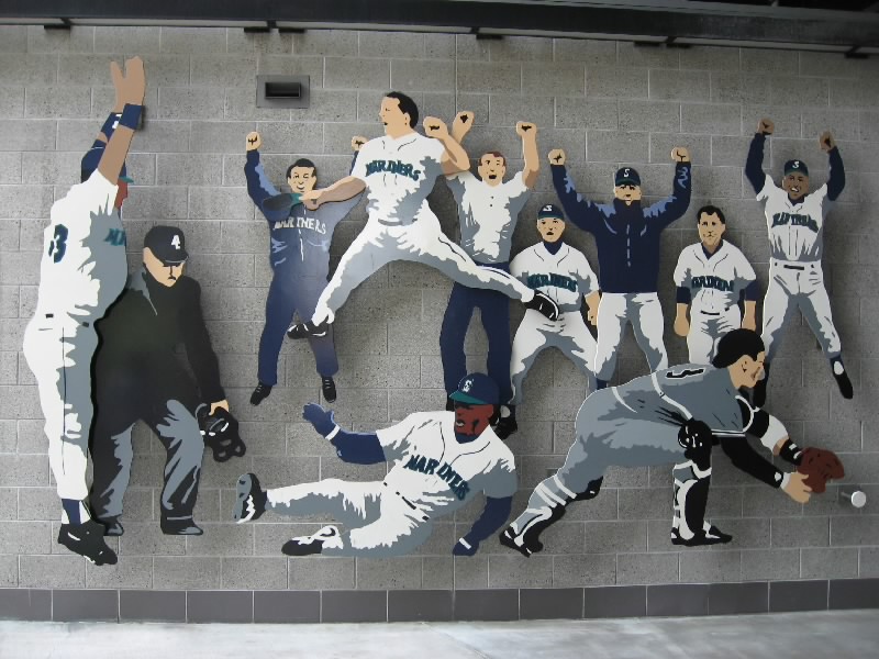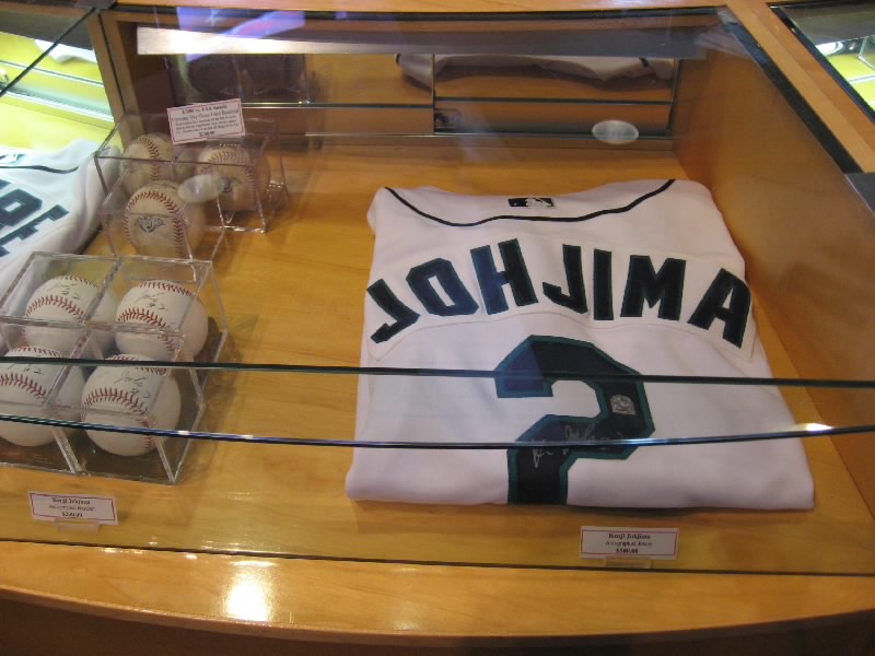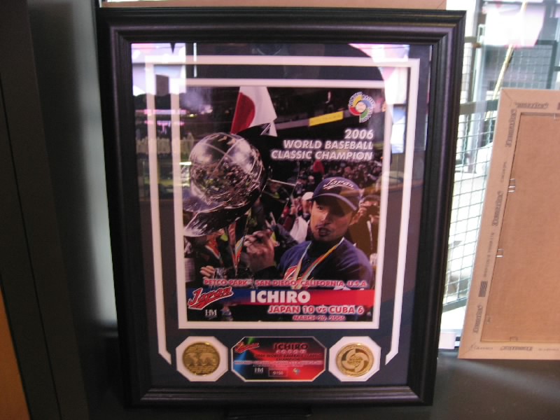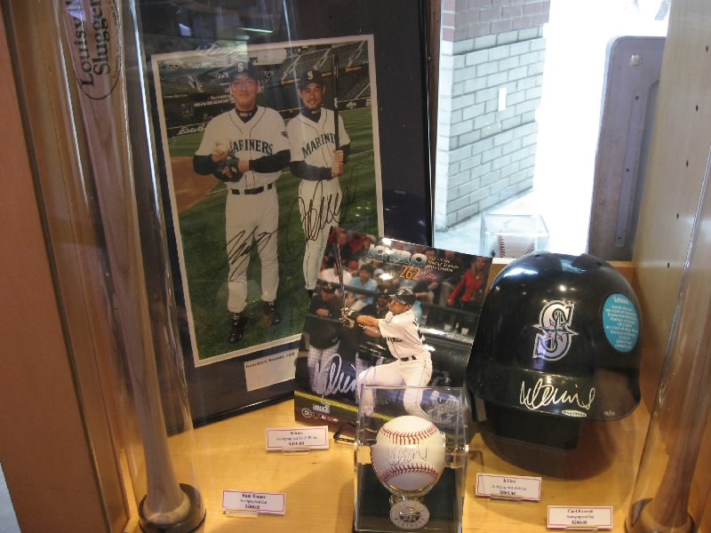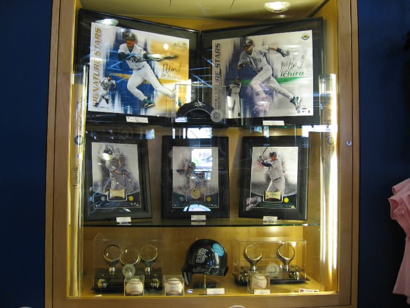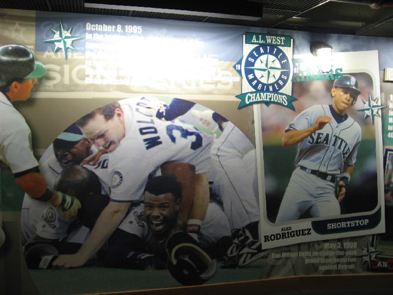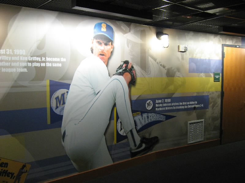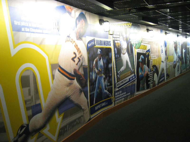 VIPエリアを過ぎ、階段を下りる。そのまま奥に行くと、そこにはマリナーズの歴史が壁にずっと描かれている。初代ユニフォームは、今見るとなんだかダサいなあ。これをもしもイチローが着ると思うと・・・どうだろ。昔のスタジアムや、1995年の初優勝、2001年のオールスターなど生き生きとした写真がおもしろいね。あとは若かりしころのランディジョンソンやAロッドなどもいるぞ。そして最後にはイチロー。日本人最初の野手として、華々しく紹介がされている。もう少し先まで写真があれば、2004年の年間262安打なども描かれてあっただろう。