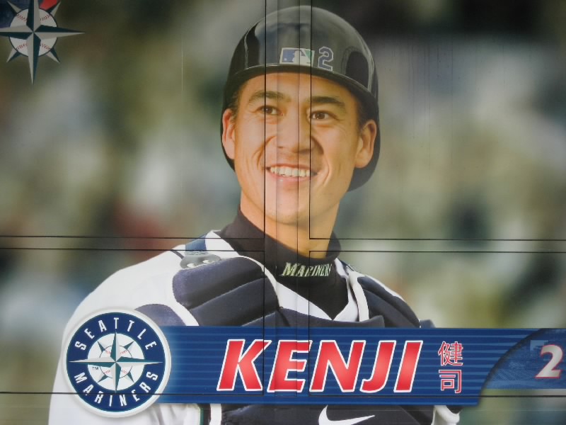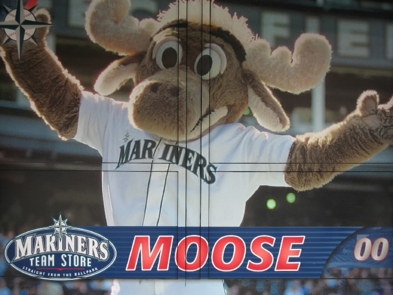 まだ1時間以上あるので、ショップを見たりスタジアムの回りを散歩したりでゆったり過ごす。イチローはマリナーズを代表する選手だけあって、グッズ類も充実している。直筆サインのある写真なども売っているぞ。あとは城島。今年入ったばかりであるが、ユニフォームやTシャツなど、いろいろと売られている。今日も活躍するといいな。ショップの外側にはマリナーズの選手の大きな写真が飾られており、イチローも城島も、そしてマリナーズのキャラクター、ムース君もいた。