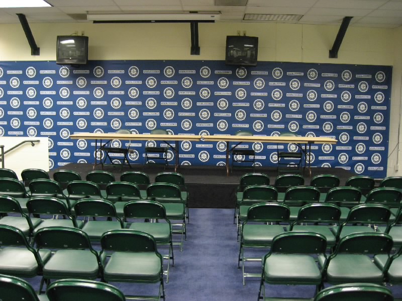 続いては球場の内側へ。途中の通路に、ムース君用のバギーが置いてあった。あの格好でこれを運転するわけだね。その後記者会見用の部屋や、会員制のバーなどを見て回る。記者会見室ではみんなが順番に席に座って記念撮影。