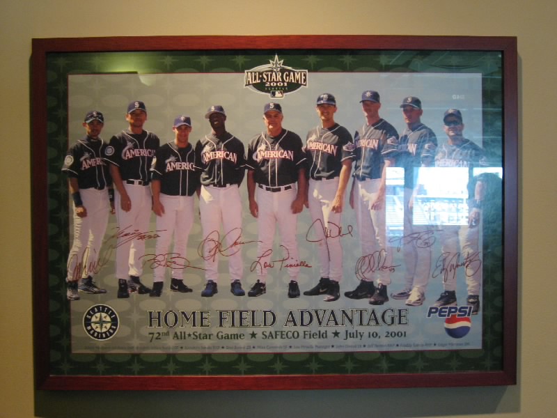 次はVIPルームへ。そこへ向かう途中の通路には、マリナーズ栄光の歴史が新聞記事や記念写真などで分かるようになっている。特に2001年はマリナーズにとって最高の年で、西地区を史上最多の116勝で優勝、そしてオールスターをセーフコフィールドで開催し、8人もの選手が出場したのだ。そしてそこには、イチローと佐々木。日本人にとっても、最高の年だったわけだね。