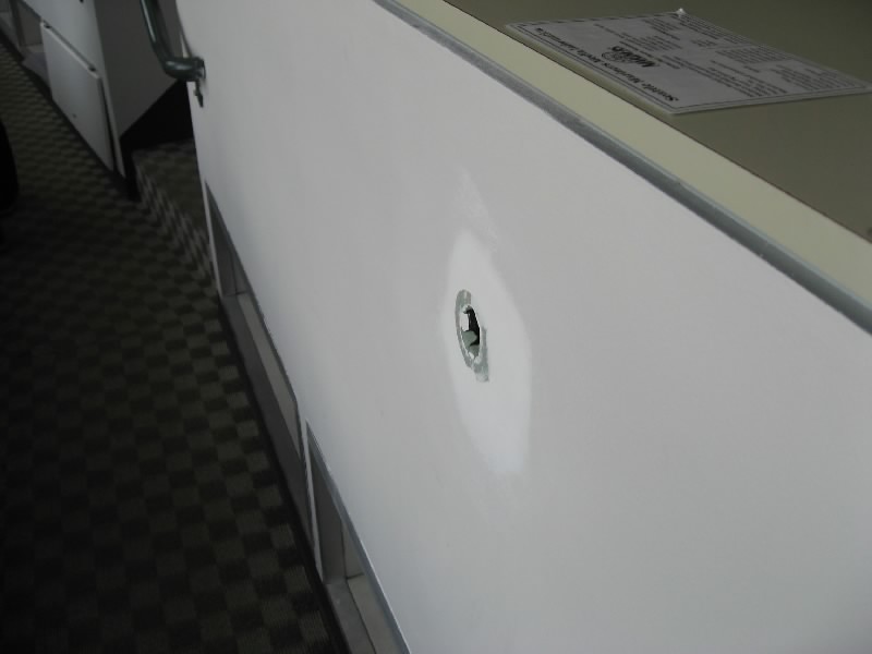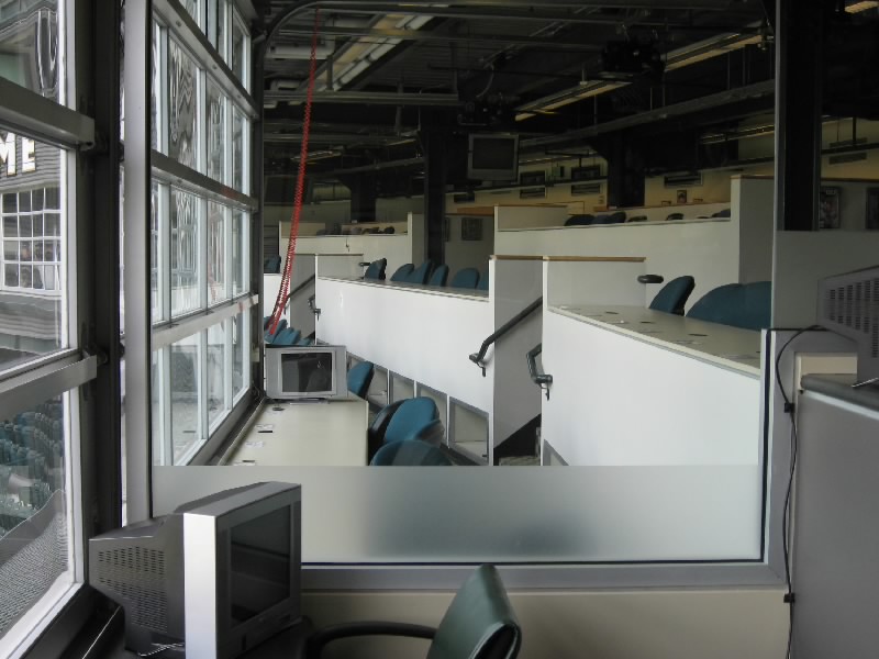 最後は記者席へ。VIPエリアのすぐ下なので、ある意味最高の見晴らしだ。各席には記者の名前が入っており、NHKや日刊スポーツなどの名前もある。ガラス窓があるのだが、開閉が自由なので開いていることも多いのだろう、なんと壁にファールボールであいた穴が残っている。かなりの勢いで飛んでくるということだが、よそ見はしていられないわけだ。