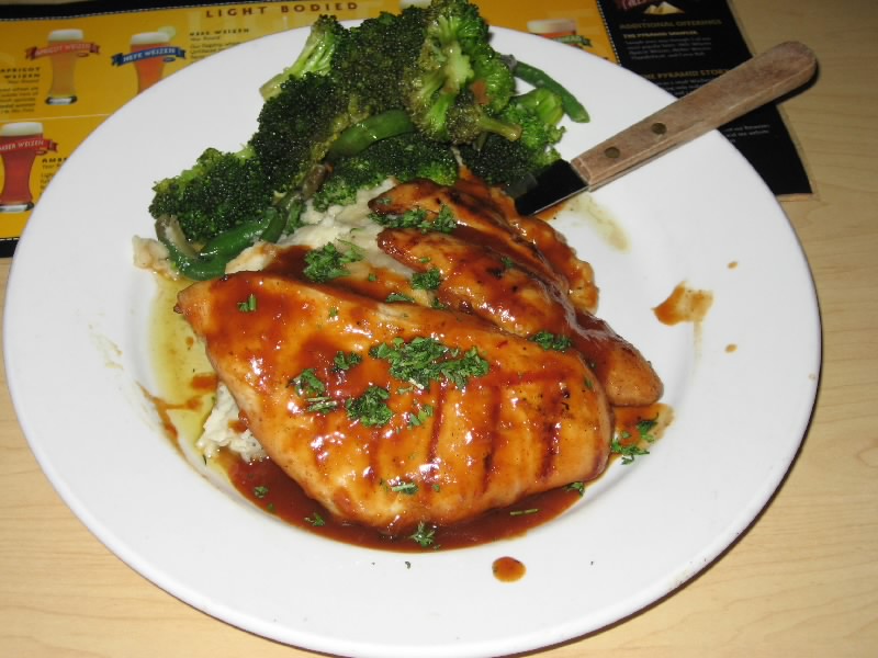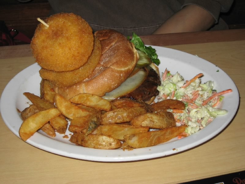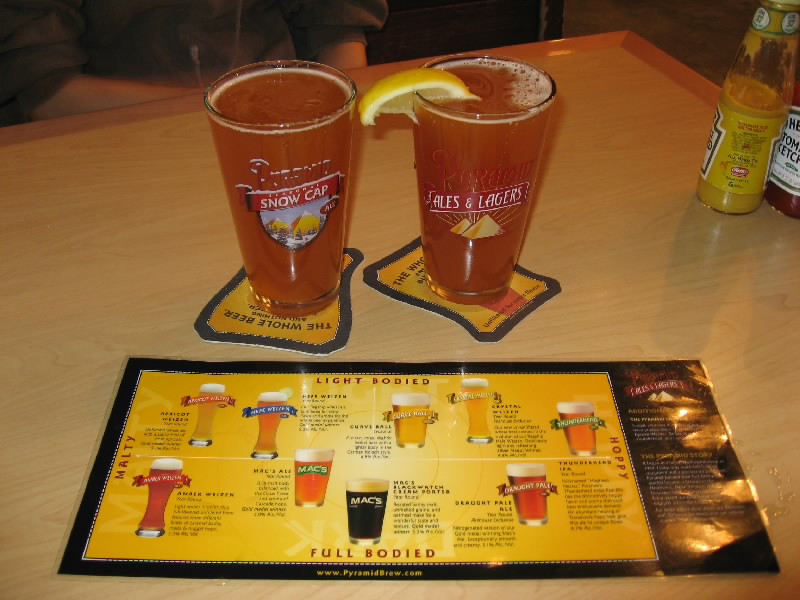 ふう、歩き回って結構疲れたな。そんなときには向かいのPyramid Ale Beerhouse。ビールの醸造もしているところで、アメリカンレストランとなっているのだ。結構にぎわっているようだが、無事に席をゲット。さあて、まずはビール。のどが乾いたので、おすすめで軽めのを頂きましょう。あとはハンバーガーと、チキンのハラペーニョグリルをオーダー。さて、どんなものが出てくるかな。まずはビール。少し濁った感じが、いかにもここでつくりました、という感じ。2種類頼んだのだが、どちらも口当たりが軽くておいしい。一つはApricot Weizen、アプリコット風味がさわやかだ。もう一つはHefe Weizen、レモンをしぼってすっきりした味わい。しばらくはビールを楽しむ。他のテーブルに運ばれているのを見ると、なんだかでかいなあ。そして登場したものは・・・ま、想像通りだけどね。ハンバーガーはまさにアメリカ、オニオンリングやポテトがすごいよ。ハンバーグがおいしいのだが、さすがにこの揚げ物たちの完食は無理。チキンのハラペーニョグリルは、思ったよりもずっと辛い。大量のマッシュポテトでまろりながら食べるが、やはりマッシュポテトの完食は無理。ちょっと濃いめのDraught Pale Aleをお代わりし、ご機嫌にいただきました。満腹($43)。