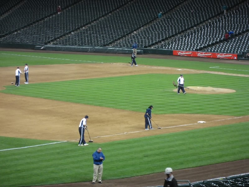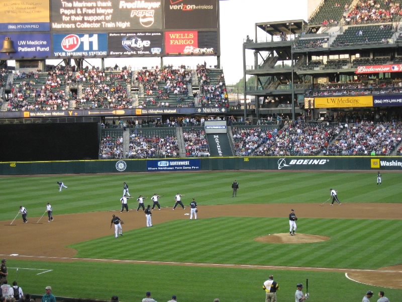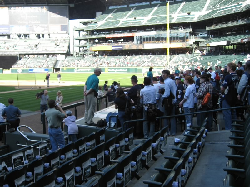 スーパーを見ていると時間はすぐに過ぎる。5時を回ったので、そろそろ行きましょうか。スタジアムへと戻るのだが、今はもう多くの人が行き交っている。WILL CALLのチケット売り場に行き、今日と明日の分を無事に引き換えた。さて、中に入りましょう。荷物検査を通り、スタジアム内へ。昼間はあれほどがらんとしていた通路が、たくさんの人でいっぱいだ。いろんなお店もあいているので、あとでゆっくり食べましょう。座席はメインスタンド1階の最後列。グラウンドとの距離はあるが、見やすい席だ。ちょうどマリナーズの選手たちがベンチに戻ってくるところ。イチローや城島はいるのかな?遠くてちょっと分からなかったが。