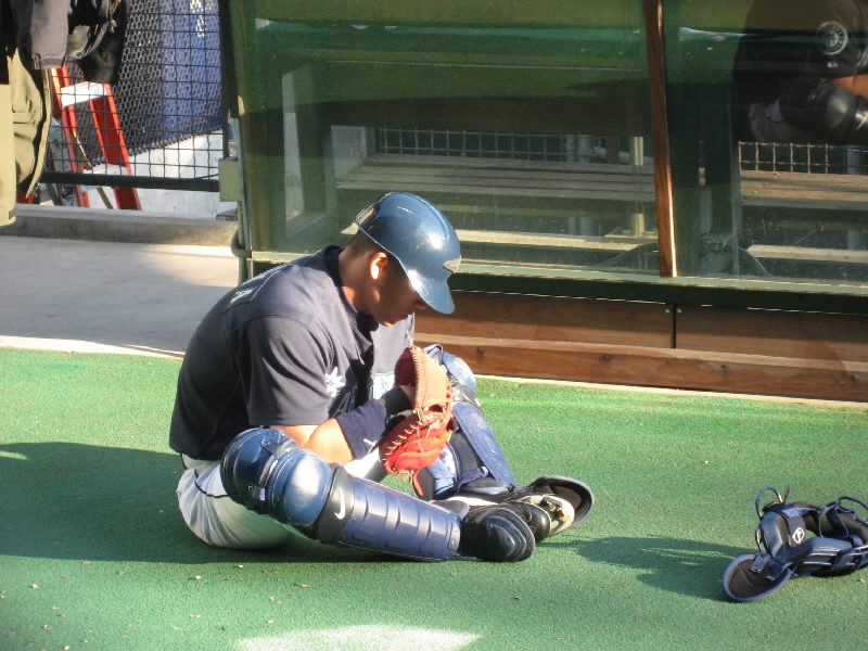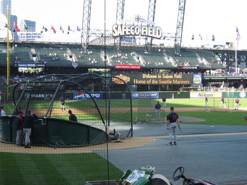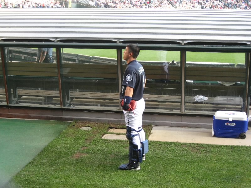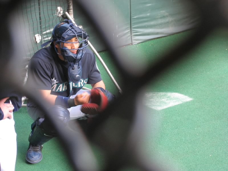 まだ時間はあるので、ブルペンの方へ行ってみよう。レフトの裏にあるブルペンエリアへ行くと、まだ誰もいない。でもしばらく待ってみよう。VIP席らしきひとたちがブルペンのところで何やら説明を受けたりしているのだが、ちょうとインディアンズの打撃練習中で、時々ホームラン性のボールが飛んでくると危ないぞ。一度ははねかえったボールがおじさんの股間へ・・・危ない危ない。試合開始までもう30分を切ったぞ。誰もこないのかな、と思い始めたところ、ベンチから歩いてくる小柄な選手がいるが・・・城島だ。回りがでかいので小柄に見える。でもブルペンに来た城島は、やはりごつい。いかに大リーグの選手たちがでかいかということだね。しばらく肩ならしやストレッチなどをしている。今日の先発のモイヤーが登場し、ピッチング練習スタート。目の前で見る城島のキャッチングは、やはり迫力がある。しばらくして試合開始前の国歌斉唱。このときは練習も中断して、ヘルメットをとるんだね。練習を終え、城島はモイヤーとともにベンチに戻っていった。マリナーズの正キャッチャーとして、がんばってほしいものです。