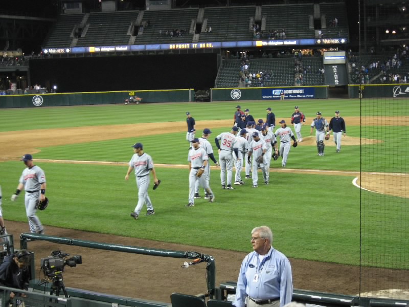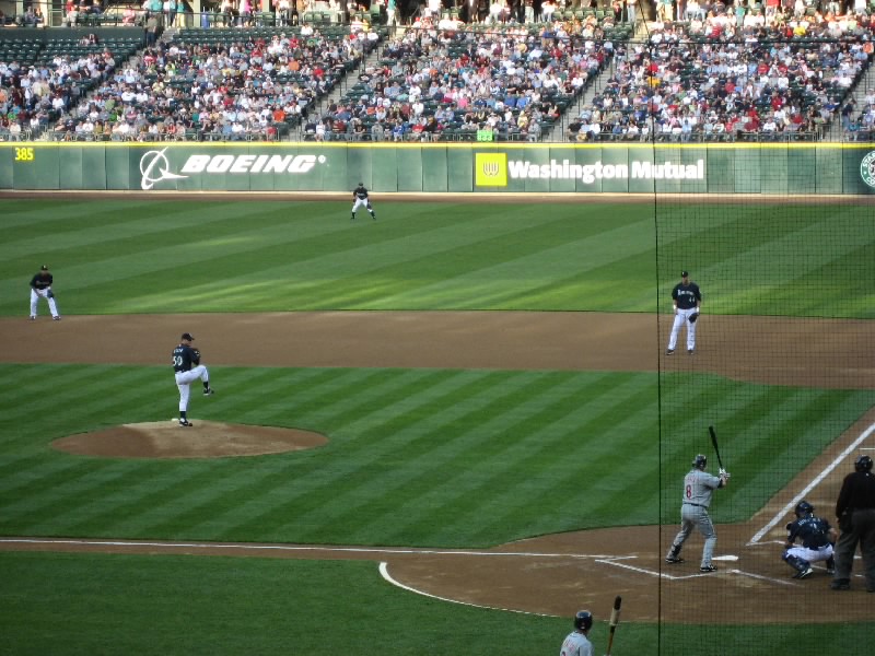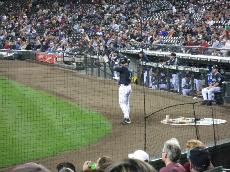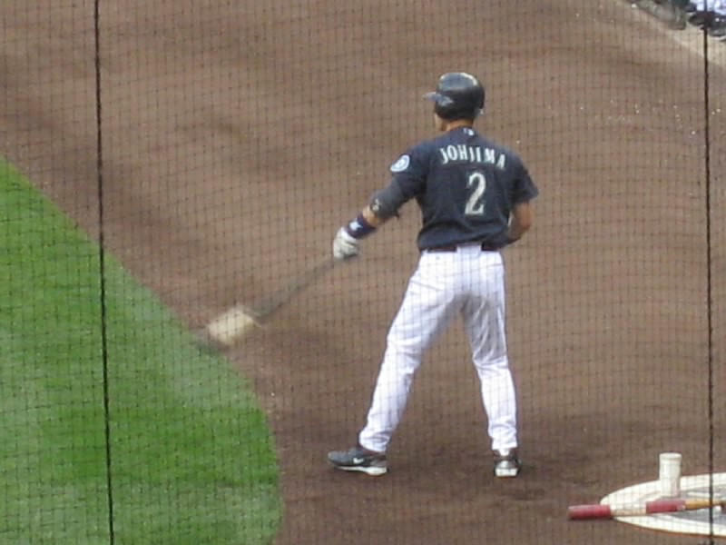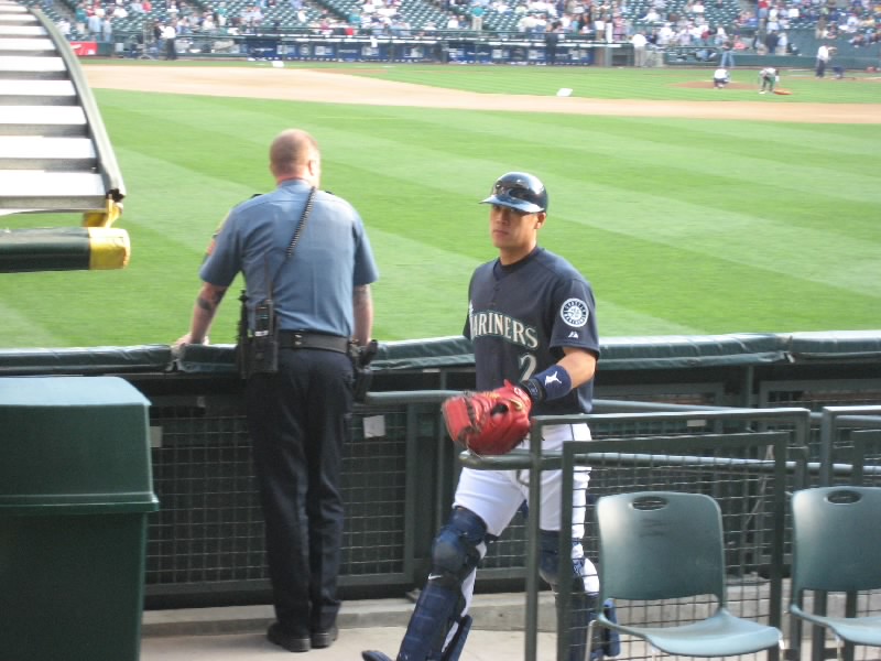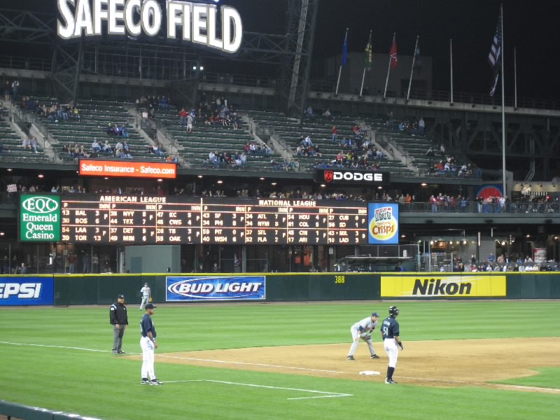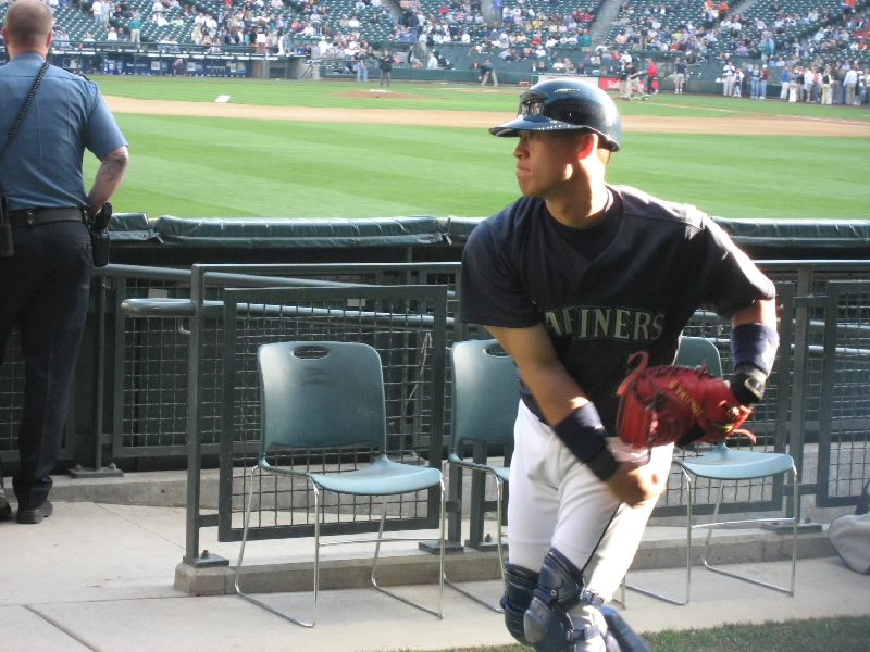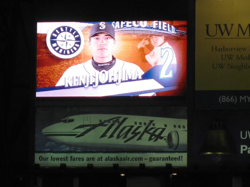 試合は相変わらずの劣勢。マリナーズも点はとっているのだが、今日はピッチャーがよくない。7回に変わったソリアーノ、8回で変わったシェリル、グリーンと途中で変わったピッチャーはとにかくフォアボールの嵐。これはちょっときついなあ。打たれるならともかく、フォアボールが続くと時差ぼけの身としてはとにかく眠くなるよね。8回の長い守備の途中で今日はあきらめたとばかりに帰る人が目立ち始めた。我々は途中で帰るつもりはないし、前のほうが空いたので行けるところまで行ってみましょう。バックネット裏、前から10列目くらいまで来たぞ。ここだとテレビに写るかもね。8回の裏、二人出れば城島まで回る。ところが先頭のセクソン、次のエバレットが凡退。ダメかなと思ったら、相手のエラーもあり、ベルトレ、ロートンが出塁。そして城島だ。おそらく今日最後の打席だろう。チャンスだし、何とかヒットを・・・ライトフライ。うーん、今日の城島は結局ノーヒットに終わった。