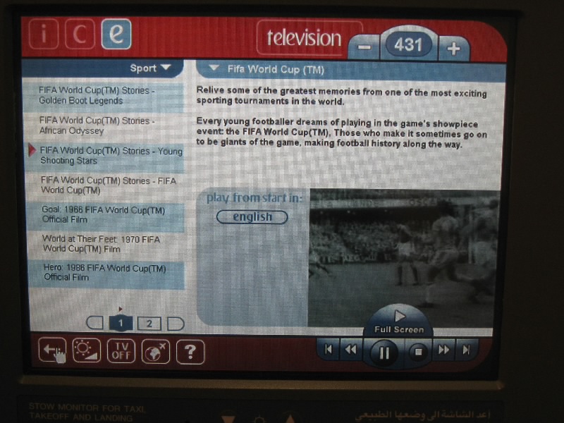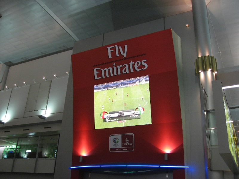 ドバイ待ち時間と、デュッセルドルフ到着直後用の軽食をローソンでゲットし、出発ゲートへと向かう。ほとんどのお店が閉まっているので人は少ないが、エミレーツの出発ゲート前にはブルーのユニフォーム姿の人がちらほらいるぞ。他の人も、多くはブラジル戦にいく人たちだろう。搭乗が始まる。座席につくと、エコノミーの各席にモニターがついている。それ自体は今時珍しくはないのだが、画面が大きいこととその内容。ものすごく充実しているのだ。映画や音楽、ビデオプログラムやゲームなど、実に数百にも及ぶチャンネルがある。